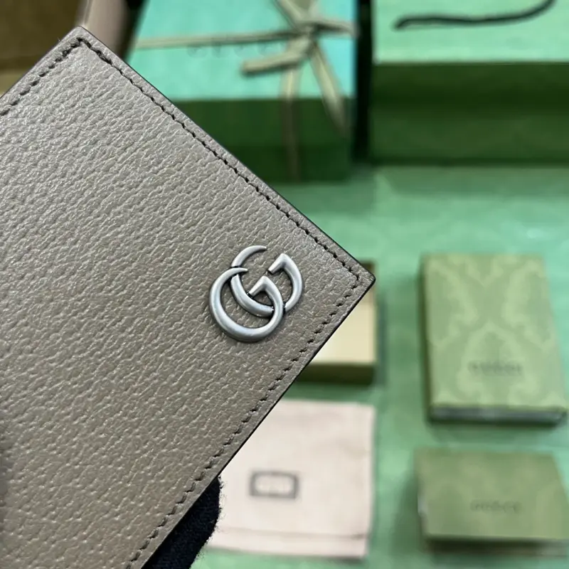 GG Marmont wallet. Gbag continues to update its color palette, adding more refined shades. In new colorways and combinations, the brand reinterprets the classic GG Marmont collection with a modern perspective. This card holder is crafted from elegant taupe leather, with the brand’s signature hardware crafted in gold. Taupe leather, gold-tone hardware, a moir?? fabric lining with a Double G, four card slots, and two bill compartments. Model No. 428727. Dimensions: 11 cm (width) x 7.5 cm (height). Color: Elephant Grey/Original Leather.