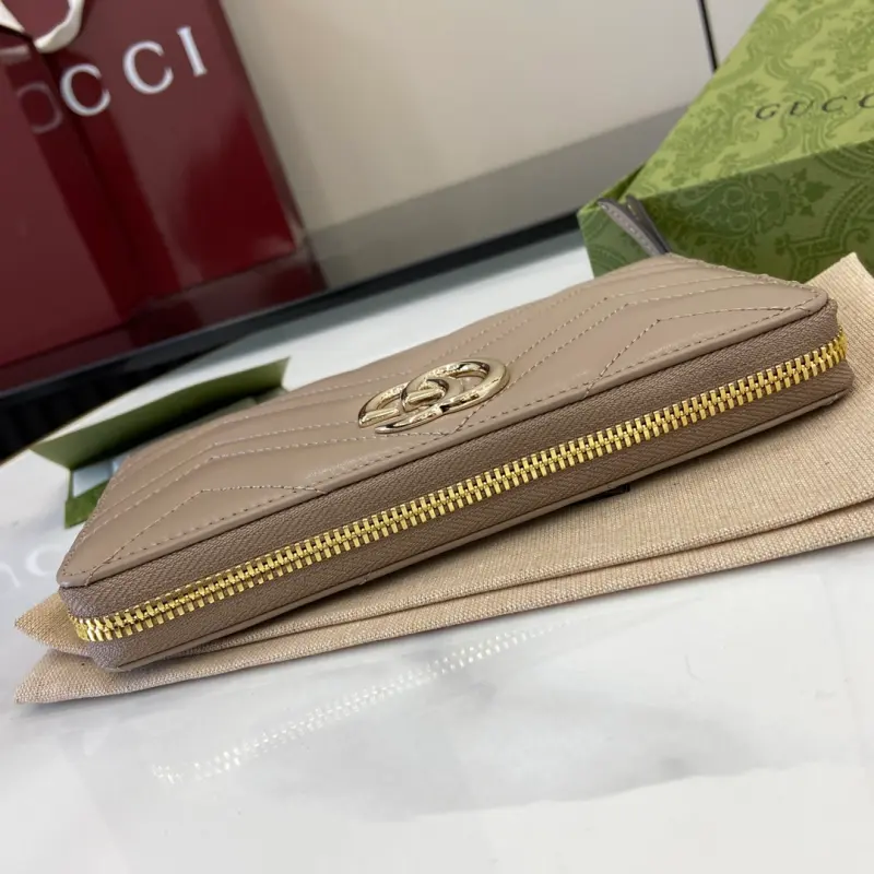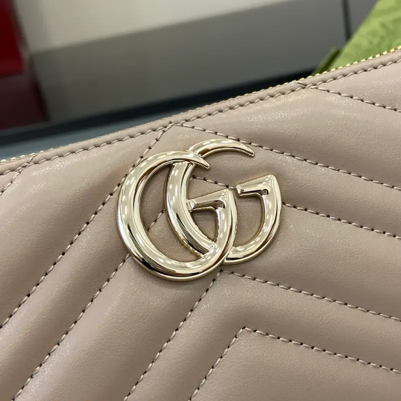[Includes full original green box packaging] GG Marmont quilted card holder. Like the various shades of taupe, Gbag’s timeless designs are reimagined with new silhouettes each season. For the Spring/Summer 2025 collection, taupe graces the new leather goods collection with a timeless, vibrant allure. This classic GG Marmont card holder is meticulously presented in a vibrant, quilted taupe-style leather. Features taupe quilted V-shaped leather, gold-tone hardware, a moir?? fabric lining with a Double G, twelve card slots, three bill compartments, and a zippered coin pocket. Model No. 443123. Dimensions: 10.5cm (length) x 19cm (width) x 2cm (thickness). Color: Taupe/Original Leather.