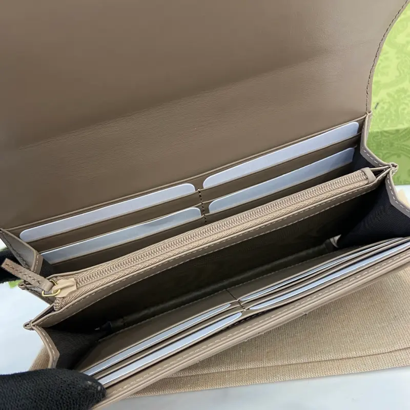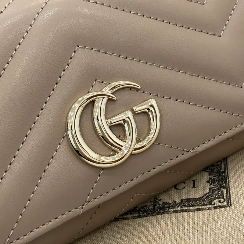 [Includes full original green box packaging] GG Marmont quilted card holder. Like the various shades of taupe, Gbag’s timeless designs are reimagined with new silhouettes each season. For the Spring/Summer 2025 collection, taupe graces the new leather goods collection with a timeless, vibrant allure. This classic GG Marmont card holder is meticulously presented in a vibrant, quilted taupe V-shaped leather with gold-tone hardware and a moir?? fabric lining with the Double G. It features twelve card slots, three ticket slots, and a flap closure. Model No. 443436. Dimensions: 19cm (width) x 10.5cm (height) x 3cm (depth). Color: Taupe/Original Leather.
