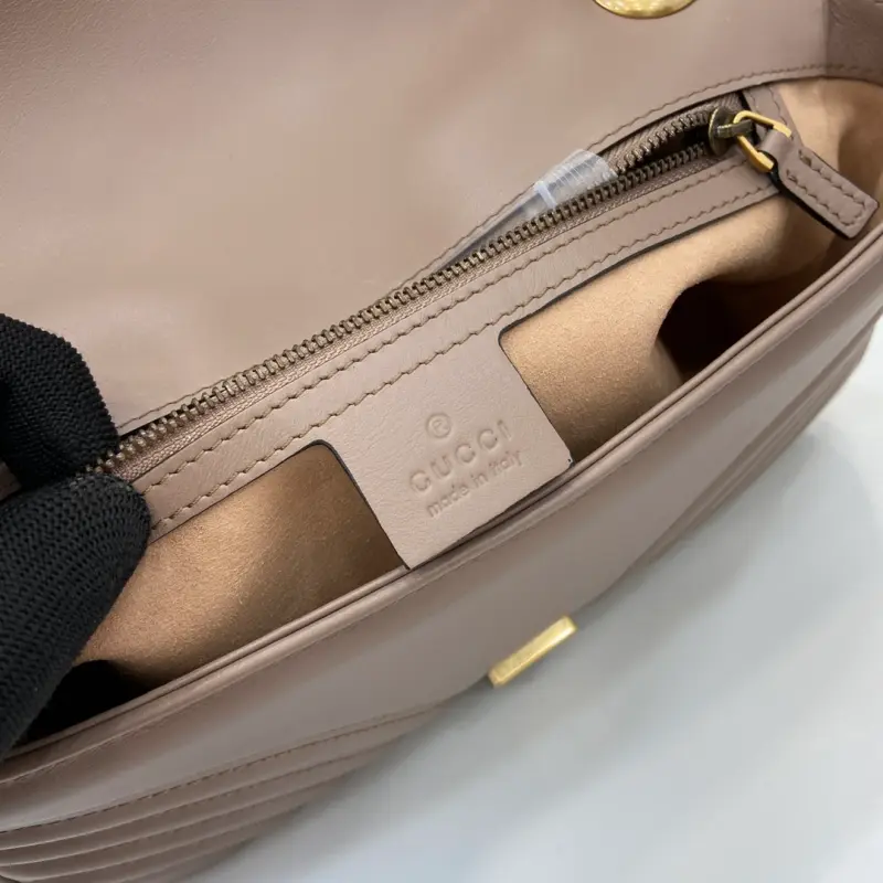 Imported original leather [comes with a full set of original counter packaging] GG Marmont metal chain shoulder bag, soft structure, oversized flap, embellished with double G accessories. The sliding chain strap is exquisitely designed and can be carried in various ways, and can be freely converted between shoulder and hand carrying. Quilted V-shaped cowhide leather material, decorated with a heart-shaped pattern on the back. Heart-shaped pattern, milk tea color quilted V-shaped cowhide leather, bronze-toned accessories, double G zipper inner pocket, sliding chain strap can be used as a shoulder strap (55 cm high) or top handle (30 cm high). Spring buckle flap weight: approximately 0.648 kg Model: 443497. Dimensions: 26 cm (width) x 15 cm (height) x 7 cm (depth) Microfiber lining color: milk tea color/imported original leather. Italian creation