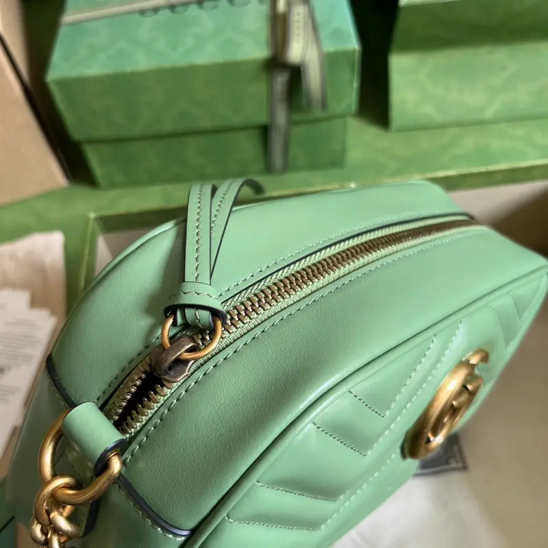 Comes with full original green packaging. Have you snagged this irresistible bag? The GG Marmont series, with its elegant and sophisticated design, has captured the hearts of many young women! It’s also a must-have for fashionistas worldwide! Absolutely amazing! (Black G hardware is vacuum-plated for a durable finish.) Model: 447632. Dimensions: 24*12*7cm. Color: Light Green/Original Leather