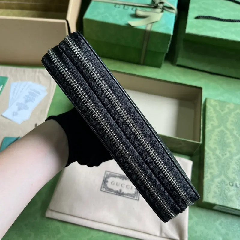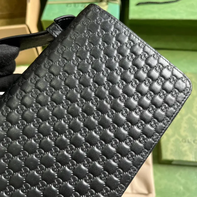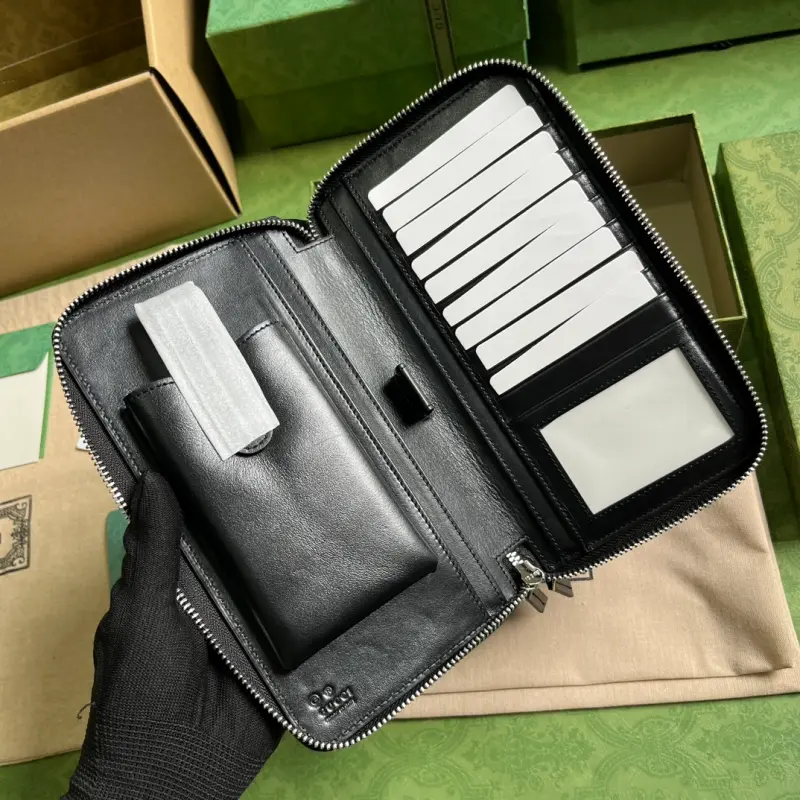 [Includes full original green box packaging] Super Double G travel document holder. The black Super Double G design makes a dazzling return in the Pre-Fall 2023 collection, appearing on a variety of small leather pieces. A reimagined interpretation of Gbago Gbag’s initials, the Super Double G motif is presented in an oversized, striking silhouette, evoking the timeless allure of the brand’s iconic logo. This travel document holder features a zipper closure, and the signature leather is a key element of the design. Lined with moir?? fabric, it features a zipper closure. Model No. 449246. Dimensions: 21.5 cm (width) x 14 cm (height) x 4.5 cm (depth). Color: Black/embossed leather.