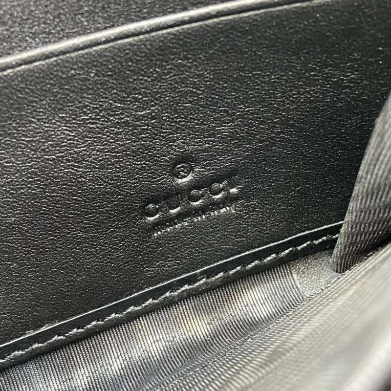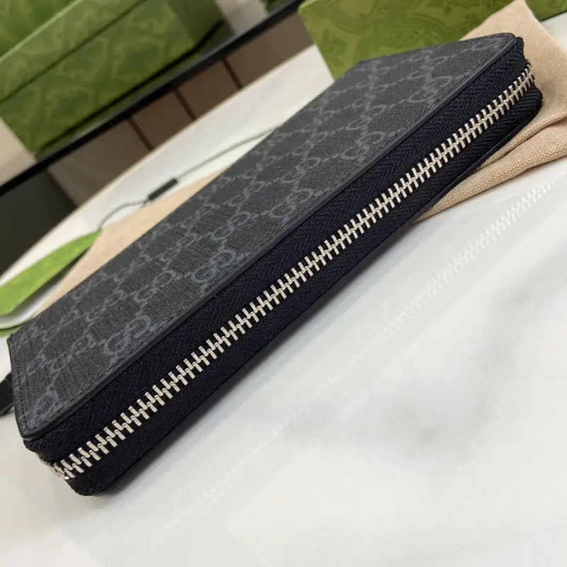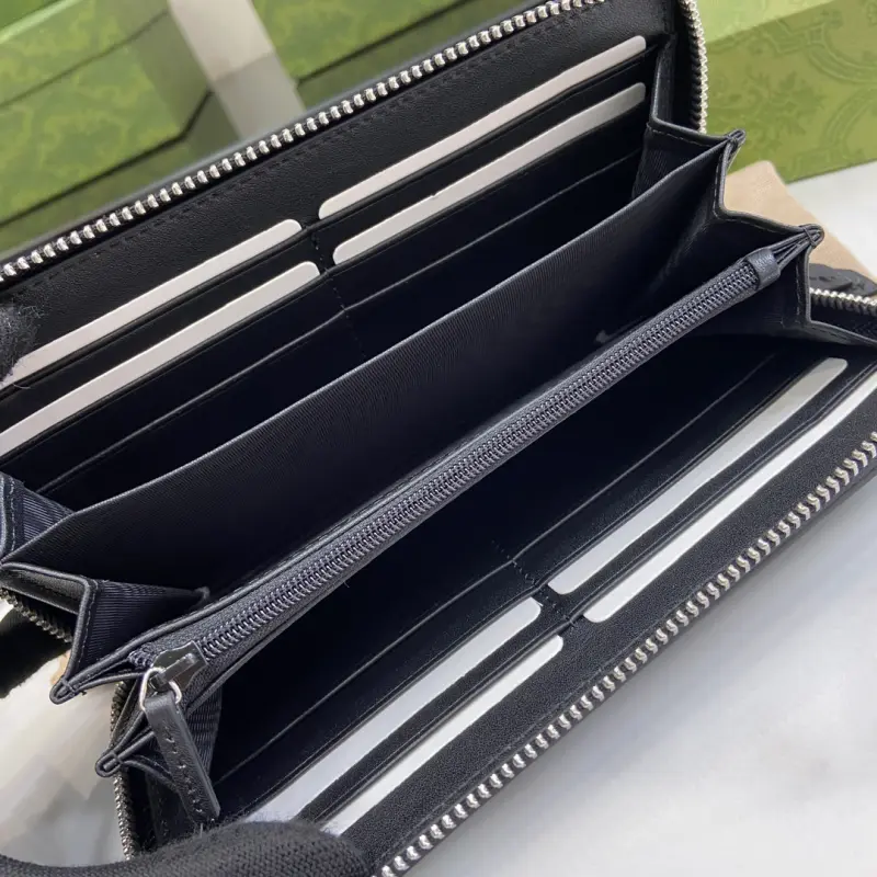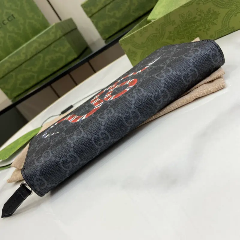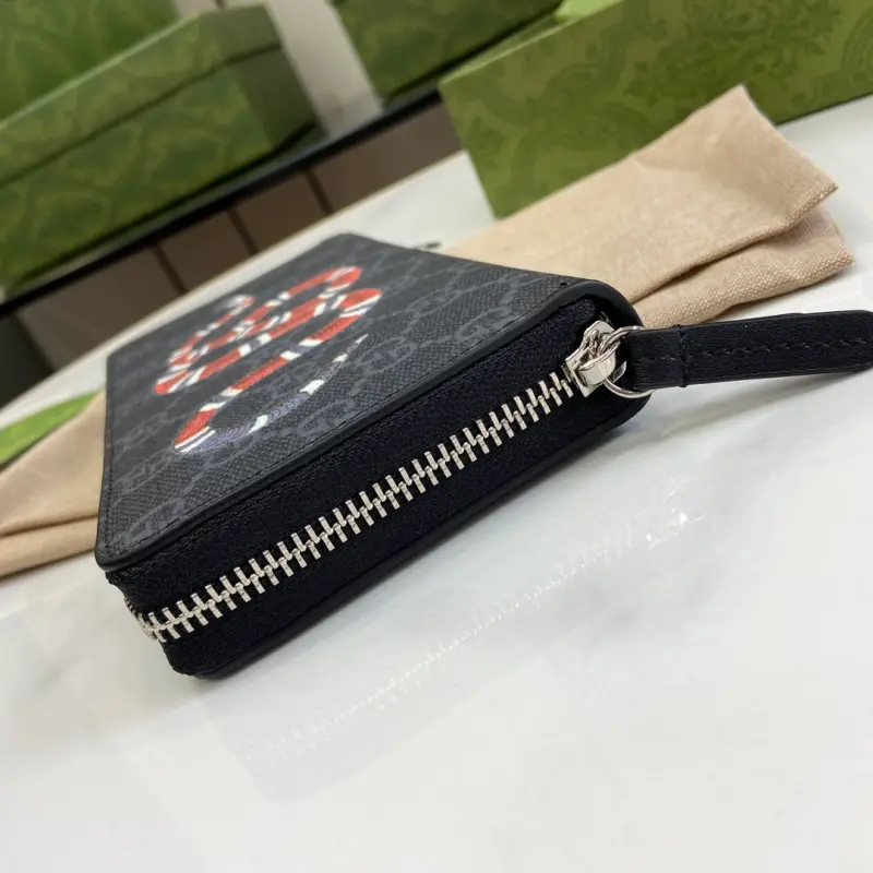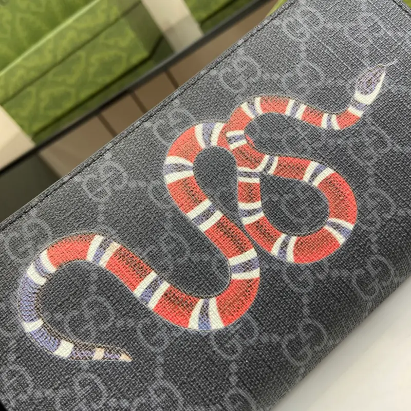 Zippered wallet with GG coral snake detailing. Gbag’s small leather accessories push the boundaries of design, constantly reinterpreting classic pieces in unique ways. This men’s wallet expertly combines classic GG Supreme canvas with black GG hardware, creating a sophisticated, modern accessory. Black leather trim, moir?? fabric lining, and GG details. Interior: 12 card slots and 3 bill compartments. Model No. 451273. Dimensions: 19cm (width) x 10cm (height) x 2.5cm (depth). Color: Black PVC/Coral Snake.