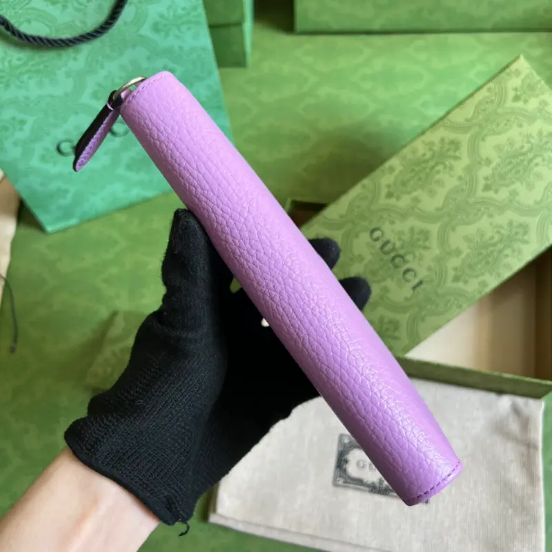 This GG Marmont zippered wallet, presented in its original green box, is a beloved design by Alessandro Michele. Each beloved design is linked to the House’s past, and the Creative Director has brought it into the present collection. At the heart of this treasured collection, GG Marmont is instantly recognizable by its Double G monogram, which appears as matching resin hardware on the top of this light purple wallet. Moir?? lining, Double G, interior zipper pocket, and buckle closure. Model No. 456117. Dimensions: 19 x 10.5 x 2 cm. Color: Light purple/full leather.