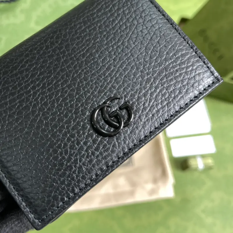 This GG Marmont card holder, crafted from timeless black leather, is a classic addition to the Aria collection. The Double G design, inspired by 1970s belt buckles, is reimagined in tonal resin on this wallet. The classic design is combined with a monochromatic color scheme for a modern and stylish look. Model No. 456126. Dimensions: 11 x 9 x 3 cm. Color: Black/full leather.