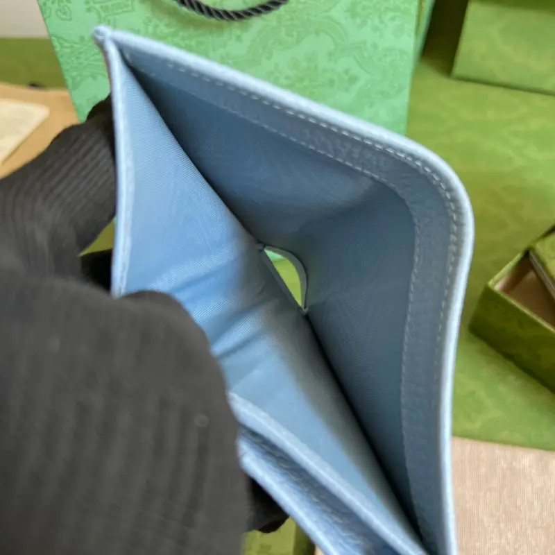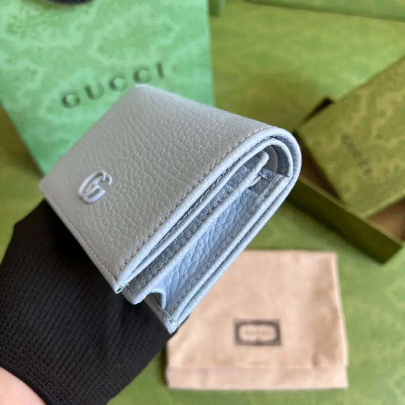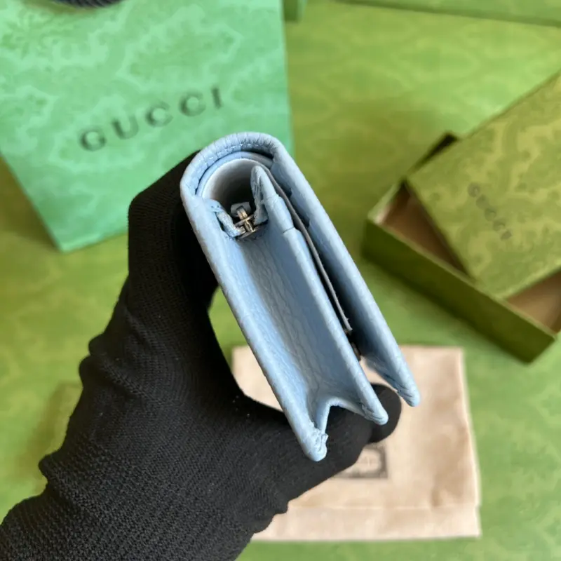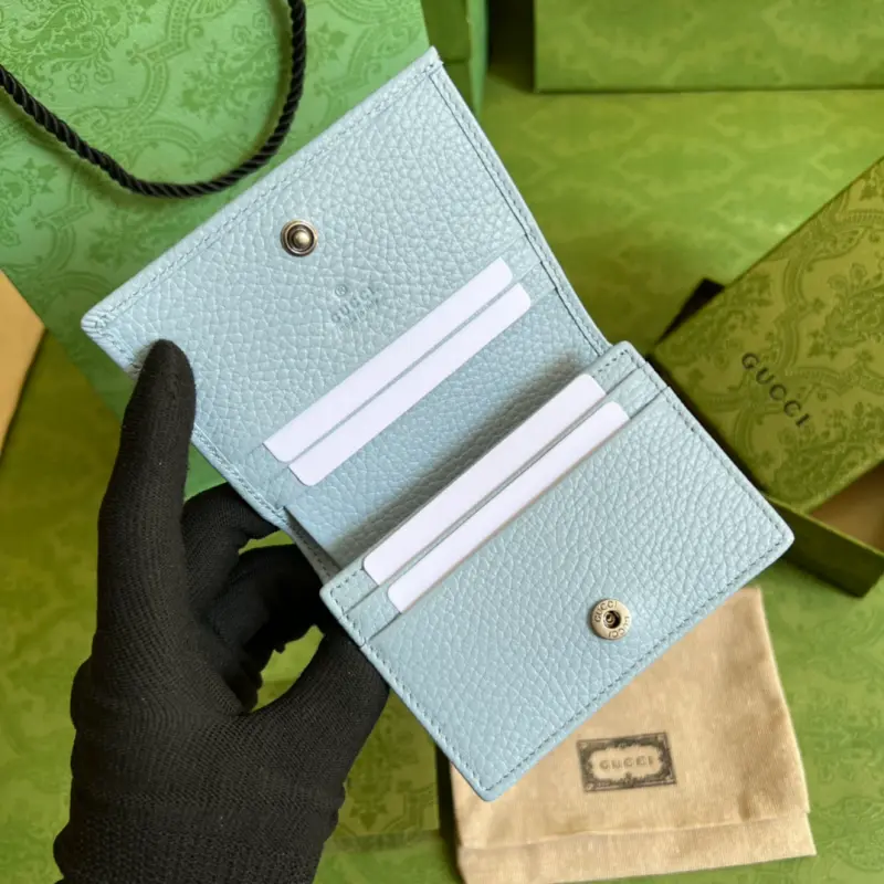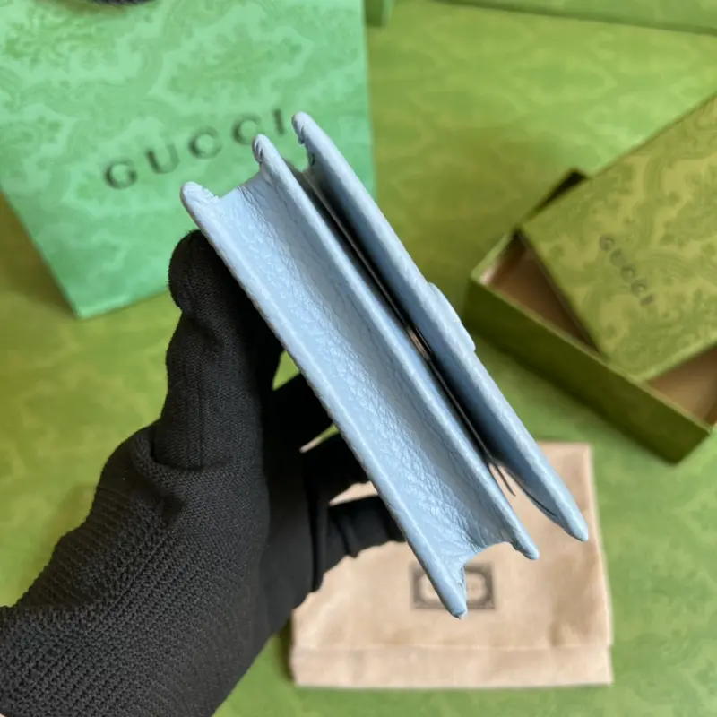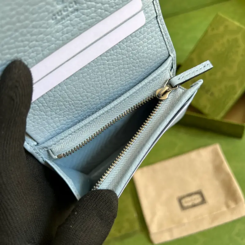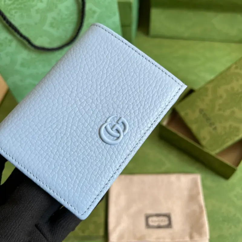 This GG Marmont card holder, crafted from timeless, two-tone light blue leather, is a classic addition to the Aria collection. The Double G design, inspired by 1970s belt buckles, is reimagined in tonal resin on this wallet. The classic design is combined with a monochromatic color scheme for a modern and stylish look. Model No. 456126. Dimensions: 11 x 9 x 3 cm. Color: Light blue/two-tone leather.