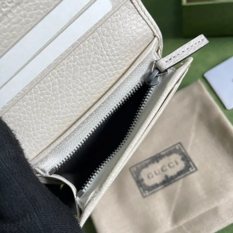 This GG Marmont card holder, crafted from timeless, durable black leather, is a classic addition to the Aria collection. The Double G design, inspired by 1970s belt buckles, is reimagined in this wallet using a matching resin. The classic design is combined with a monochromatic color scheme for a modern and stylish look. Model: 456126. Dimensions: 11 x 9 x 3 cm. Color: White/Full Leather