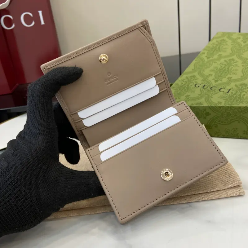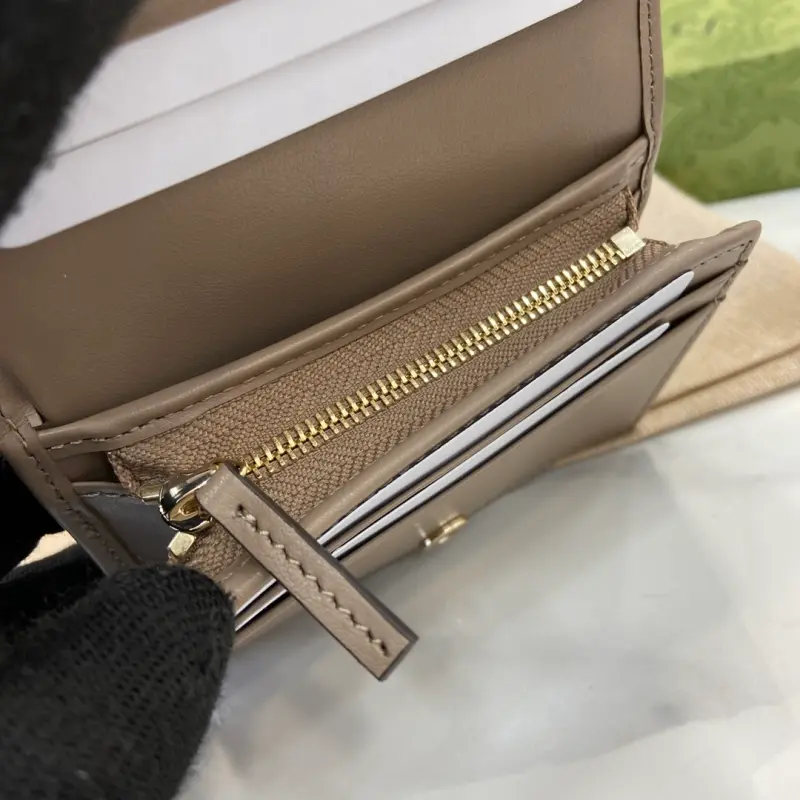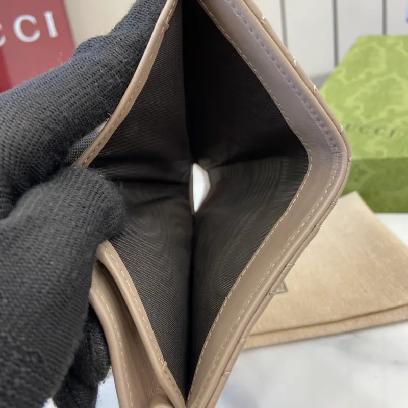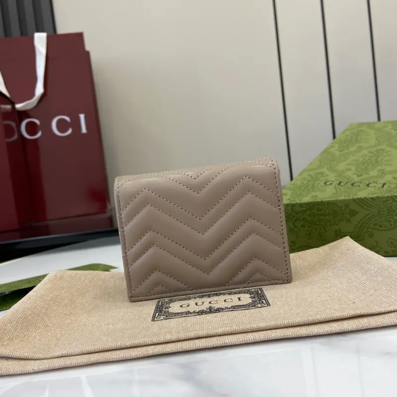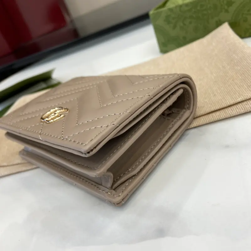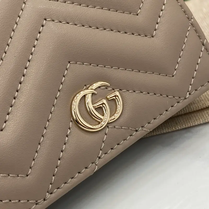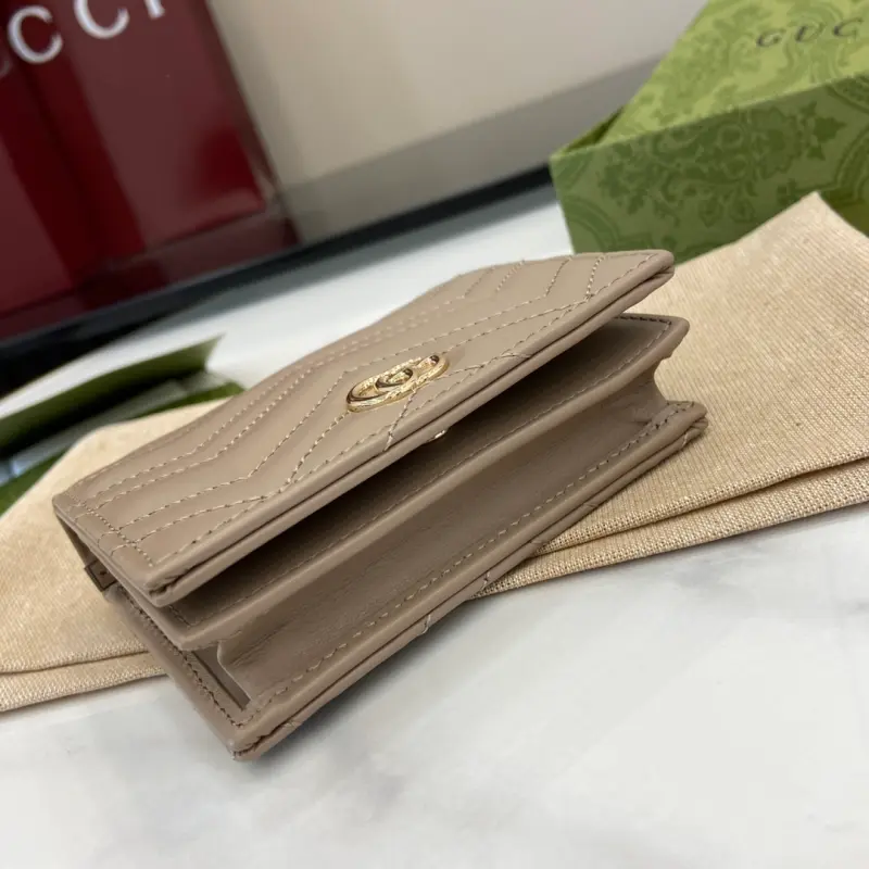 GG Marmont quilted card holder. Like the various shades of taupe, Gbag’s timeless designs are reimagined with each season. For the Spring/Summer 2025 collection, taupe graces the new leather goods collection with a timeless, vibrant touch. This classic GG Marmont card holder is meticulously presented in a vibrant, quilted taupe leather with gold-tone hardware and a moir?? fabric lining with a Double G. It features five card slots, two flat pockets, a zippered pocket, and a snap-fastening bill compartment. Model No. 466492. Dimensions closed: 11cm (width) x 8.5cm (height) x 3cm (depth). Dimensions open: 11cm (width) x 17.5cm (height). Color: Taupe/Original Leather.