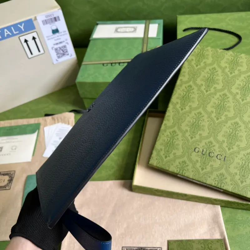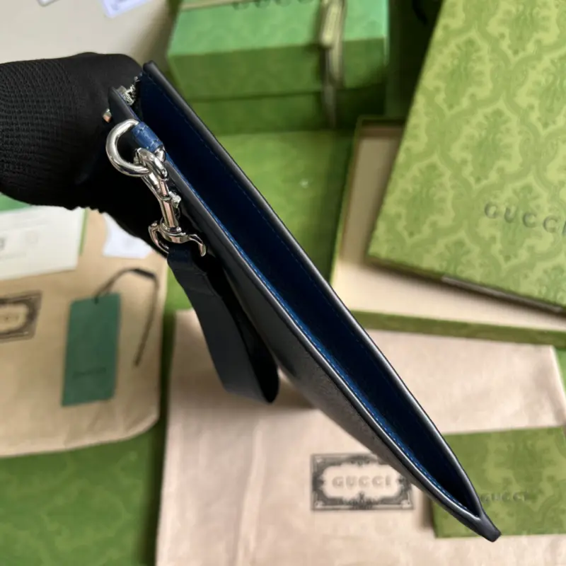 The Marmont collection continues to evolve, featuring this new, slim clutch in blue glossy leather. Miniature black Double G hardware enhances the design. The clutch features a detachable wristband for added practicality. Black glossy leather, palladium-tone hardware, viscose and cotton and linen lining, a detachable leather wristband, six card slots, and an open pocket. Dimensions: 30.5 x 21 x 1.5 cm. Model No. 475317. Color: Blue Pig Grain Leather/Blue G Hardware.