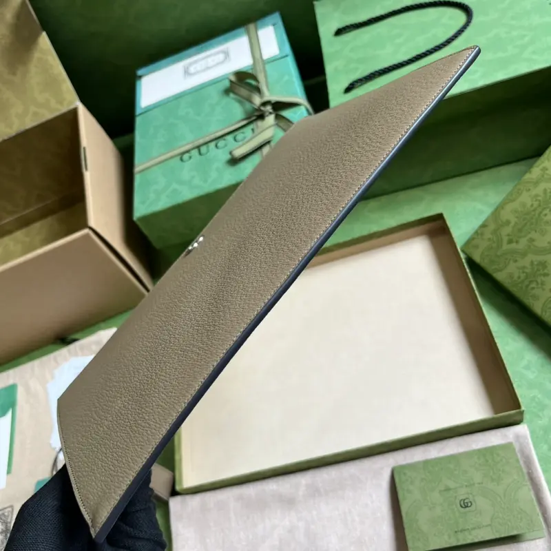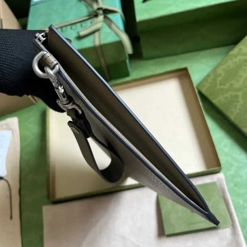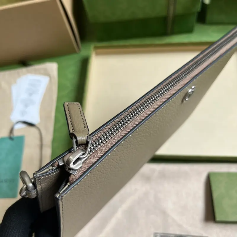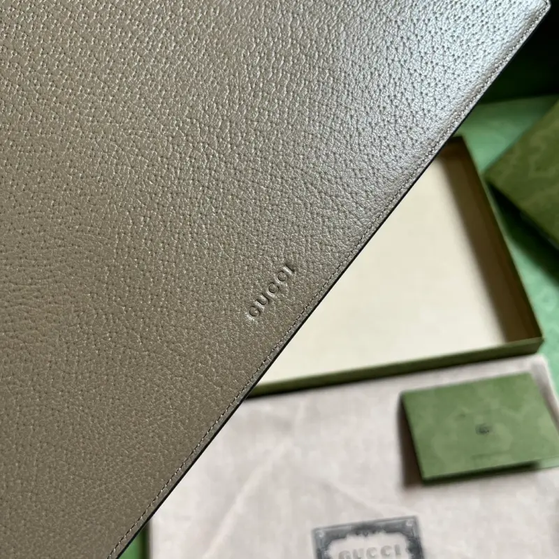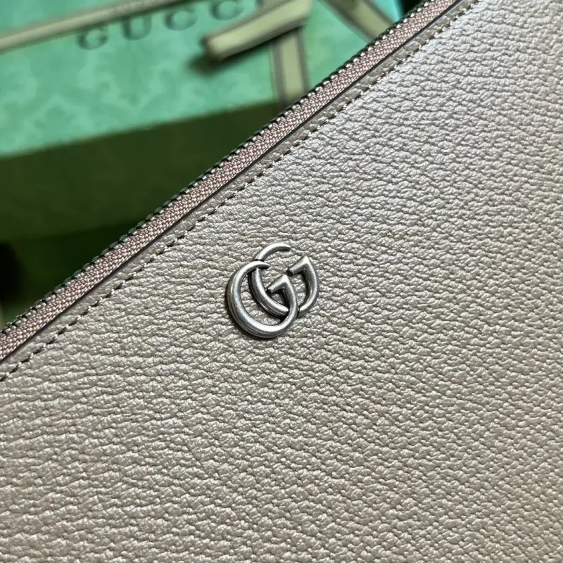 Gbag continues to update its GG Marmont clutch with more refined hues. With new color combinations and palettes, the brand reinterprets the classic GG Marmont collection with a modern perspective. This clutch is crafted from gray leather with palladium-toned branding. It features elephant gray leather, palladium-toned hardware, a detachable leather wristlet, six card slots, and an open pocket with zipper closure. Model No. 475317. Dimensions: 30.5cm (width) x 21cm (height) x 1.5cm (depth). Color: elephant gray/full leather.
