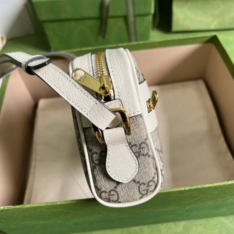 This Gbag Meo Vintage crossbody bag, complete with original green packaging, stands out from the Boundless Overture collection, infusing vintage style with modern design. The mini bag features an oval leather tag and the brand’s signature feline head. It embodies all the brand’s classic elements, creating a versatile and adorable look that’s both classic and vintage. Model: 517350. Dimensions: 17.5 x 12 x 5.5 cm. Color: White/PVC.