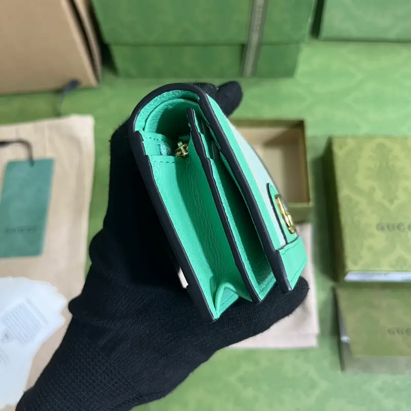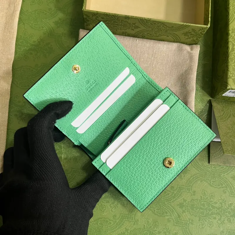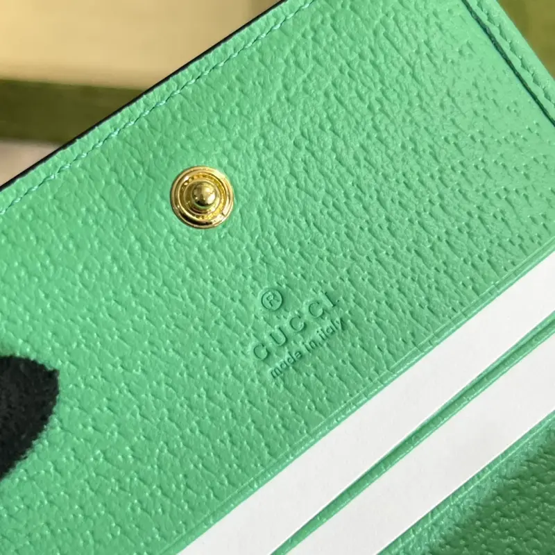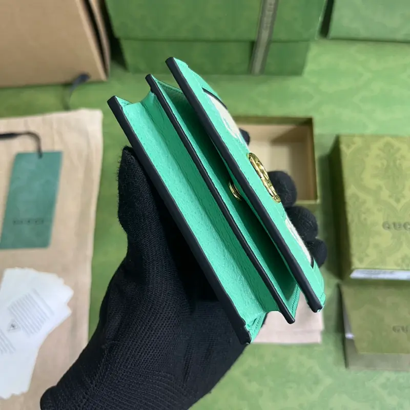 [Comes with a full set of original green box packaging] Ophidia series Super Double G card holder. The Ophidia series is reinterpreted in the 2023 early spring “Gbag Star Story” series, reshaping the classic silhouette with new color schemes, presenting a sophisticated piece with a modern style. The classic GG pattern is paired with a new color scheme of beige and mint green, complementing the double G elements. Beige and mint green Super Double G canvas, mint green leather, gold-tone hardware, cloud pattern fabric lining Double G, five card compartments, one banknote compartment, zippered inner pocket. Snap button closure. Model: 523155. Dimensions when open: 11 (width) x 17.5cm (height) Dimensions when closed: 11 (width) x 8.5 (height) x 3cm (depth) Color: mint green/Big G canvas. Made in Italy