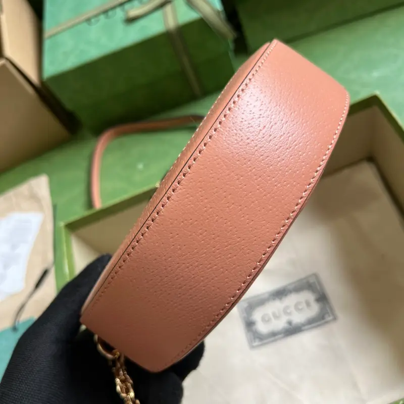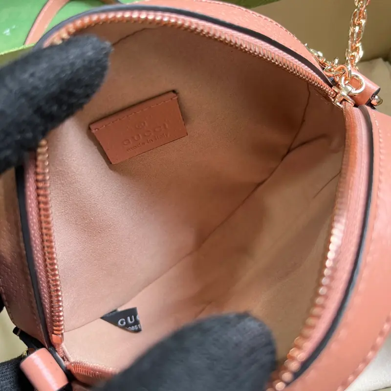 [Includes full original green box packaging] Ophidia GG mini round shoulder bag. The brand’s signature GG canvas continues to enhance this classic piece. This season, the iconic GG canvas, a symbol of the Ophidia collection, is presented in a striking new pink, complemented by rose gold hardware. Pink leather trimmings enhance the allure of this mini round shoulder bag. Made of pink GG canvas with pink leather trimmings and rose gold hardware, this bag features a suede-like microfiber lining with a Double G. The chain shoulder strap (57cm drop) features a Double G zipper closure. The bag can accommodate a maximum phone size of 7.4cm (width) x 14.9cm (length) x 0.7cm (depth). This item can also accommodate a Gbag card holder. Weight: Approximately 0.4kg. Model No. 550618. Dimensions: 18cm (width) x 18cm (height) x 4.5cm (depth). Color: Pink Leather/Pink Canvas.