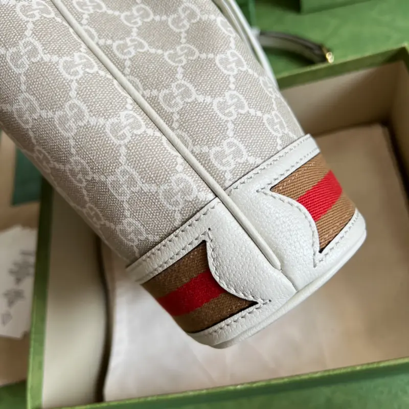The Gbag Meo Vintage bucket bag, complete with original green packaging, stands out in the Infinity Overture collection, infusing vintage style with modern design. The mini bag features an oval leather tag and the brand’s signature feline head. This mini bag embodies all the brand’s classic elements, creating a versatile and adorable look that’s both classic and vintage. Model: 550621. Dimensions: 20.5*26*11cm. Color: Beige rubber/off-white leather.