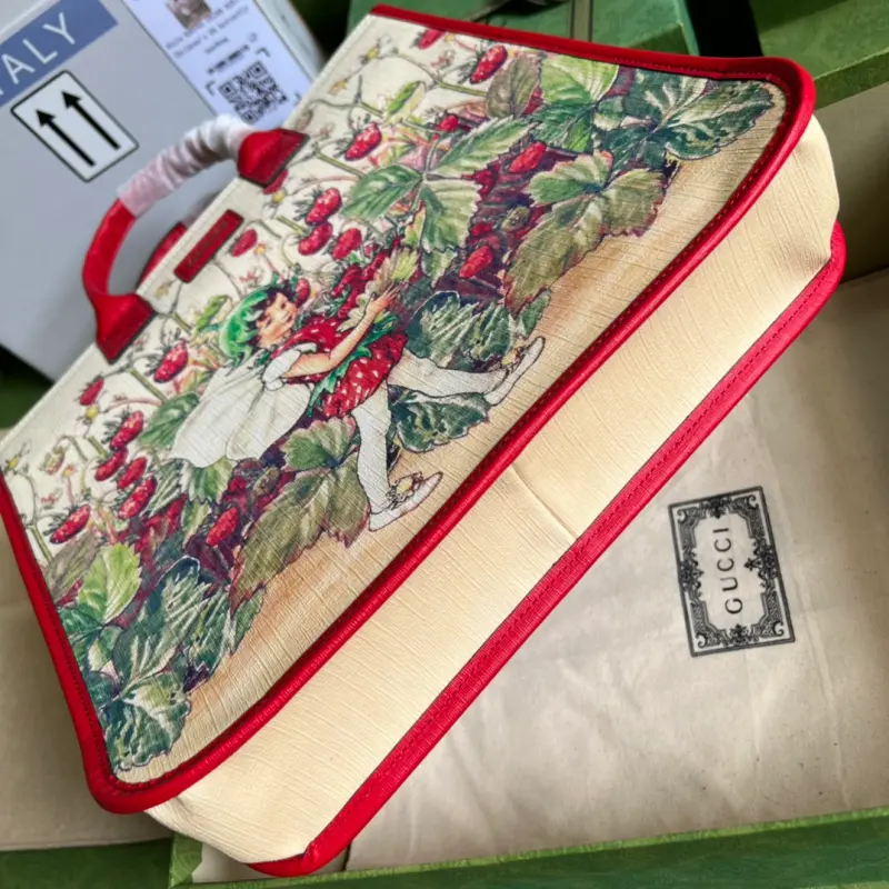 This large children’s tote bag features a strawberry fairy print, inspired by selected illustrations from Fredrick Warne’s children’s storybooks, showcasing the magical, dreamlike world of the Gbag Love March collection. This large tote features a whimsical print. The front features a playful print of fairies surrounded by strawberry bushes, and red piping adds a lively touch. Made of ivory Supreme canvas with red piping from an eco-friendly material, it features a Gbag leather logo label and a strawberry fairy print. From Fredrick Warne: The Estate of Cicely Mary Barker, 2020. Used with permission from Frederick Warne & Co. Double handles (8cm high). Model No. 550763. Dimensions: 33.5cm (width) x 31.5cm (height) x 7.5cm (depth). Color: Red/Fairy Strawberry. Made in Italy.