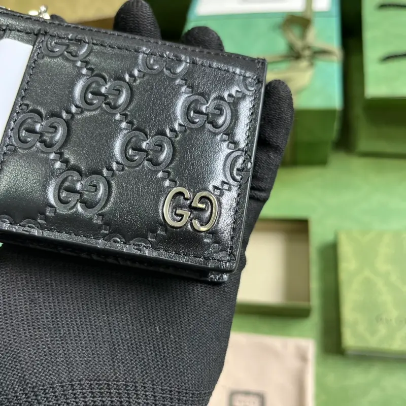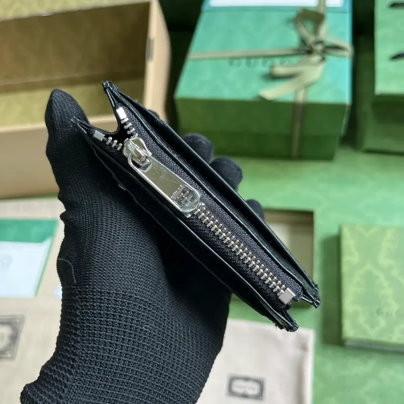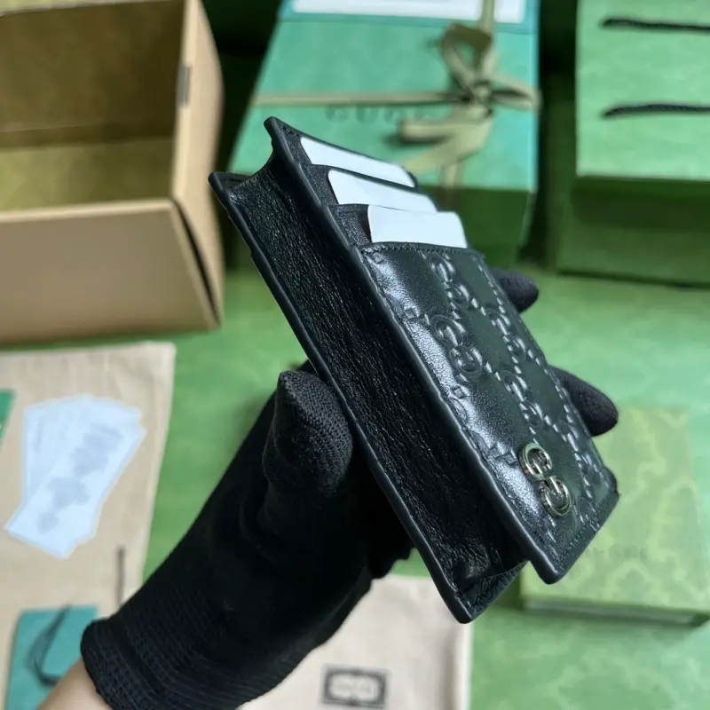 This GG Marmont card holder, complete with original green box packaging, features a new look each season, showcasing the brand’s rich heritage. This card holder is crafted from black leather and embellished with the iconic Double G symbol from the 1970s. Features black leather, gold-tone hardware, a viscose-lined Double G, six card slots, and a zippered pocket. Model No. 597560. Dimensions: 12 cm (width) x 8 cm (height). Color: Black/embossed leather.