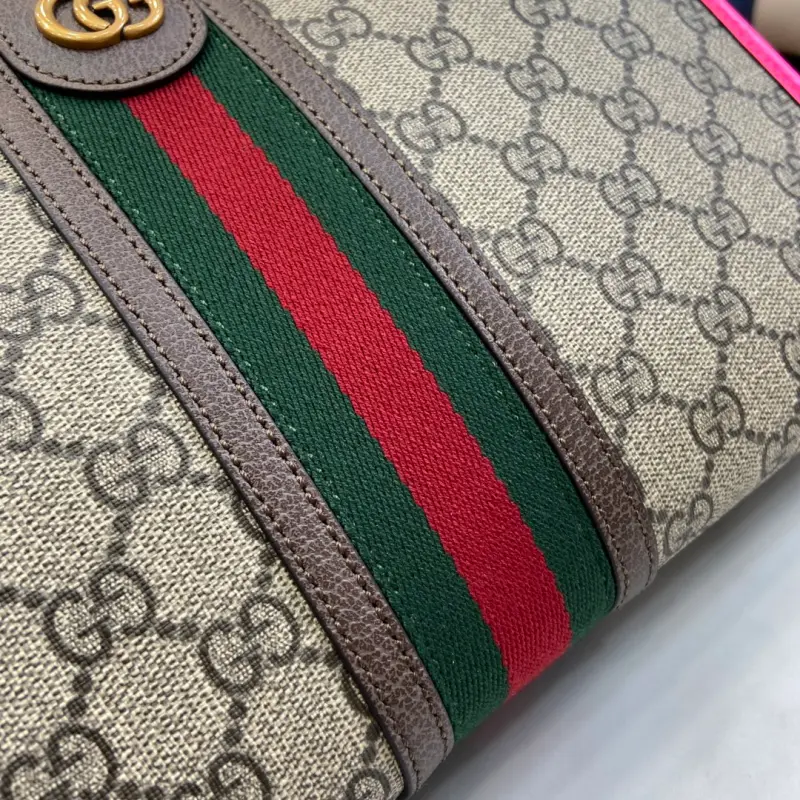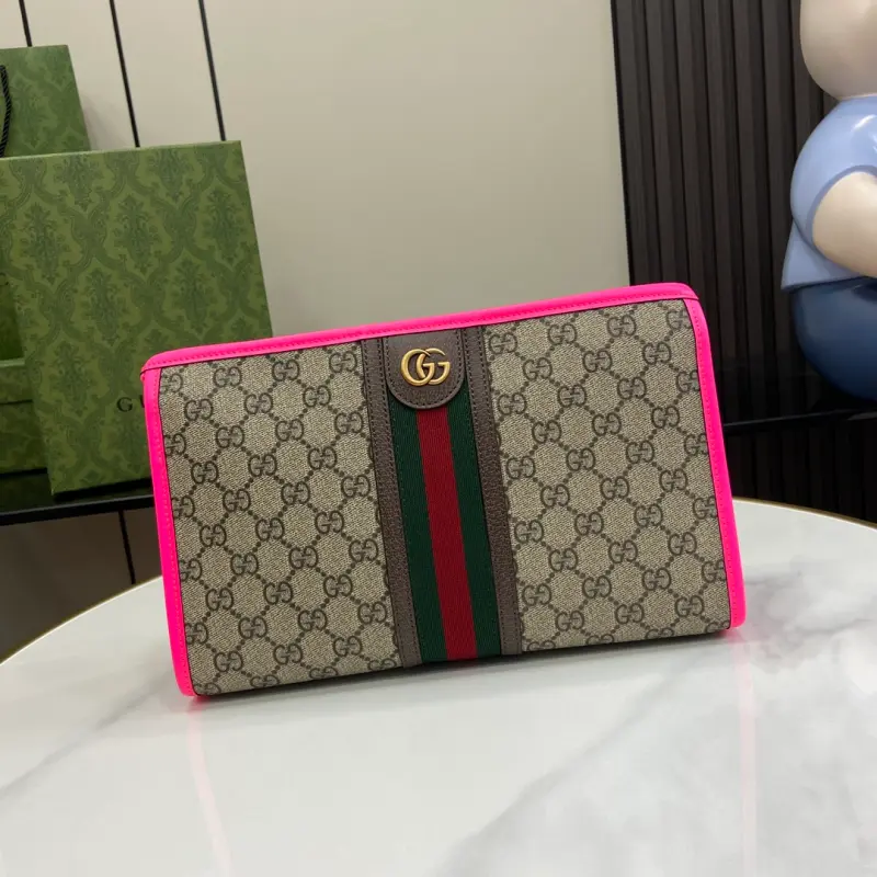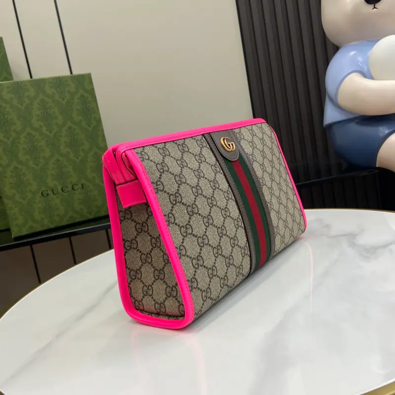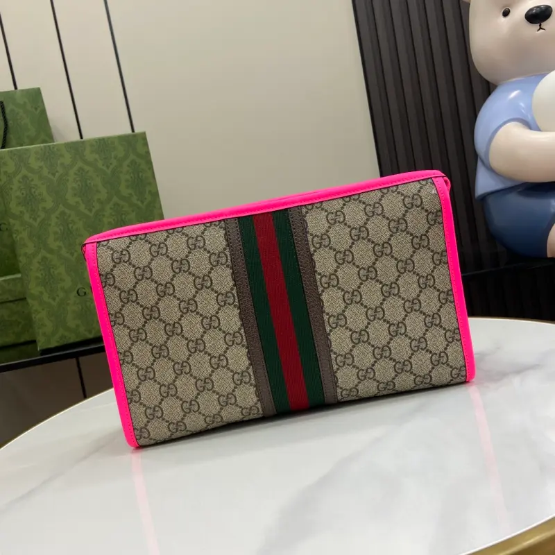 [Includes full original green box packaging] [New Arrival] GG Product Details, Style FADI7 9765. Reflecting the creative director’s contemporary vision, the Ophidia collection is brought to life with a pop of fluorescent fuchsia. This cosmetic bag combines the iconic Double G detail with beige and ebony GG Supreme canvas, a timeless combination that celebrates Gbag’s roots. Features beige and ebony GG Supreme canvas with fluorescent fuchsia leather trim, gold hardware, fuchsia and beige Web cotton and linen lining, an interior Double G zipper pocket, and zipper closure. Model No. 598234. Dimensions: 28.5cm wide x 18cm high x 9cm deep. Color: Fluorescent fuchsia/PVC.