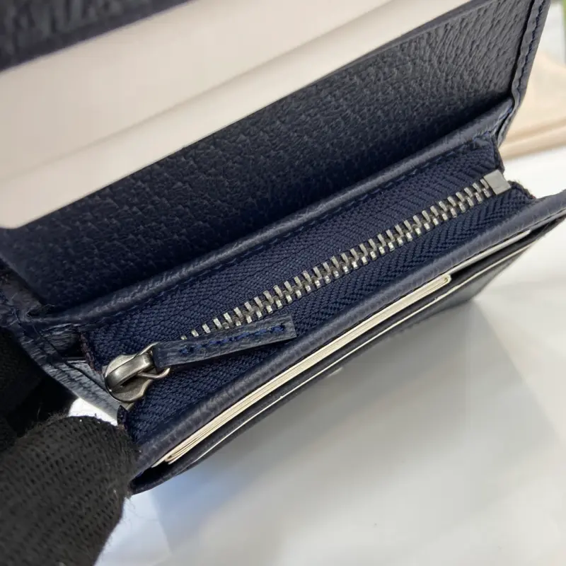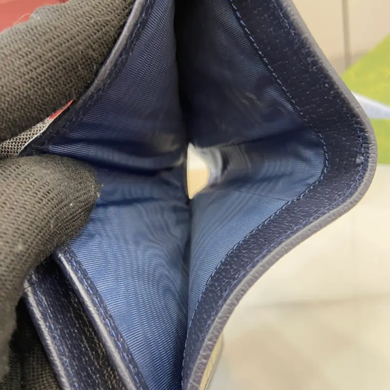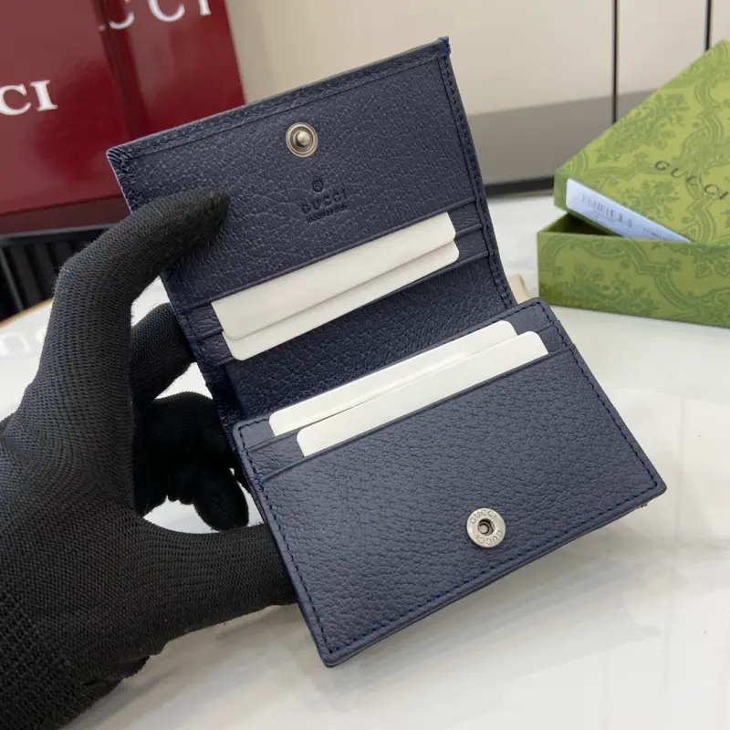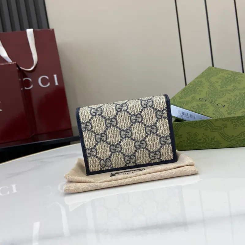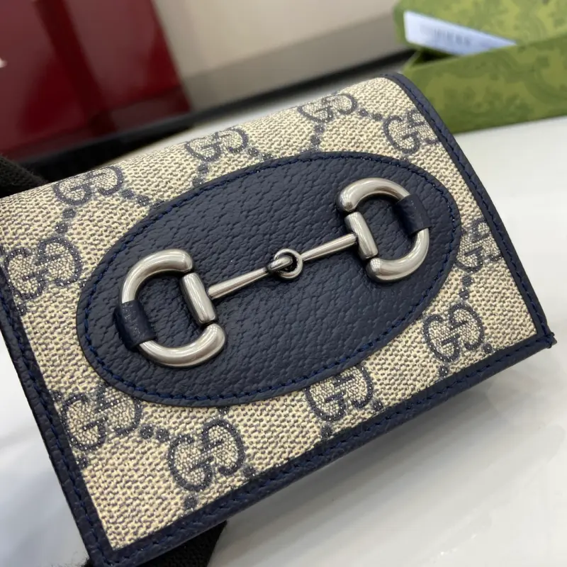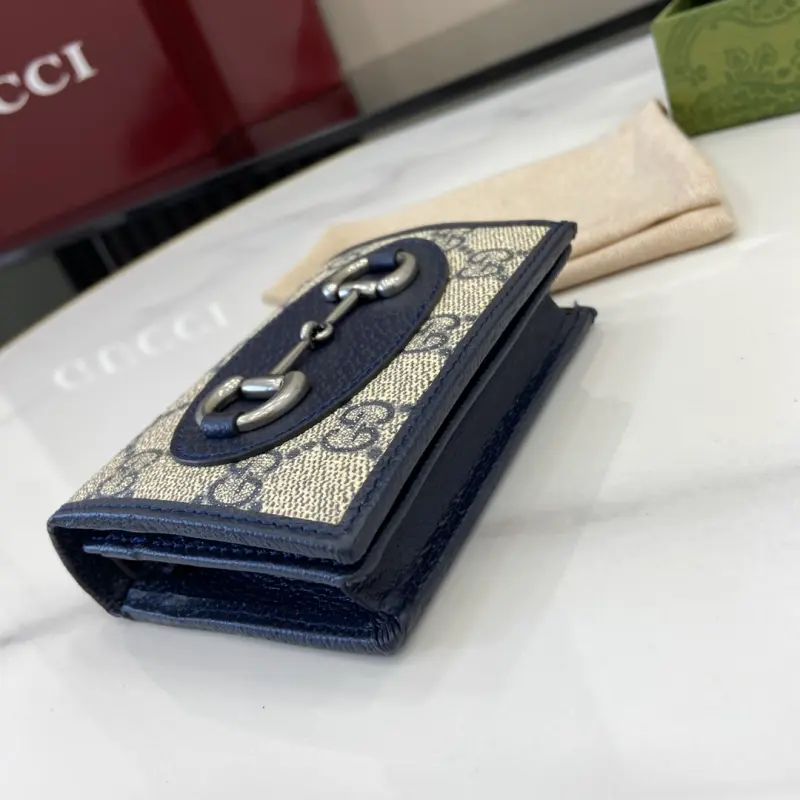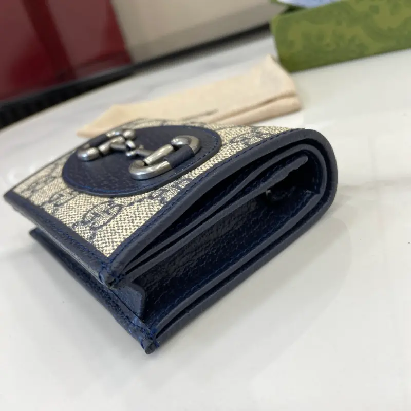 The Gbag Horsebit 1955 card holder, crafted from GG Supreme canvas and blue leather, is featured in the Pre-Fall 2020 collection. This collection features the same double-ring and elongated design as the handbags. This detail, inspired by the brand’s equestrian roots, is a Gbag classic and a signature element. Features include blue/ebony GG Supreme canvas, blue leather details, gold-tone hardware, viscose lining, and horsebit detail. Interior features five card slots, one open pocket, one zipper pocket, and one bill compartment. Snap-button closure. Model No. 621887. Open dimensions: 11 cm (width) x 17.5 cm (height). Closed dimensions: 11 cm (width) x 8.5 cm (height) x 3 cm (depth). Color: Blue/PVC.