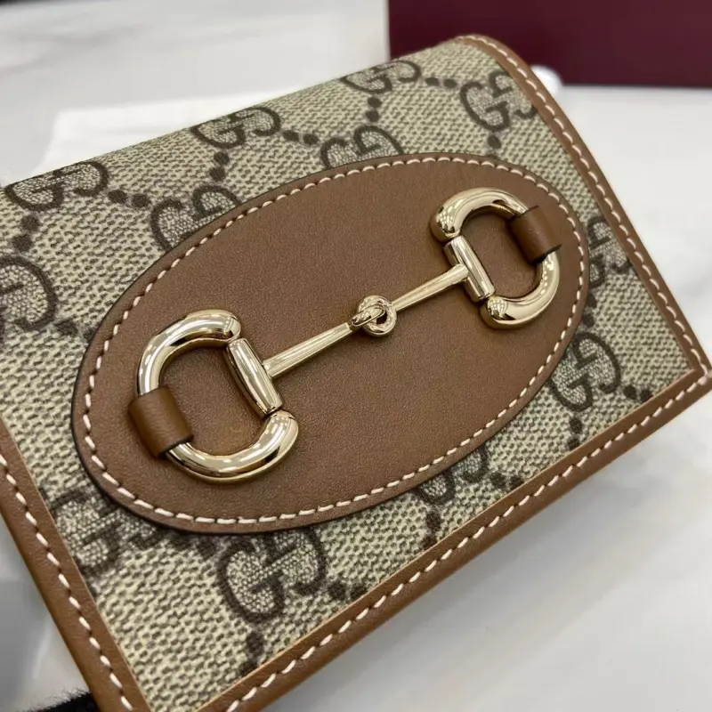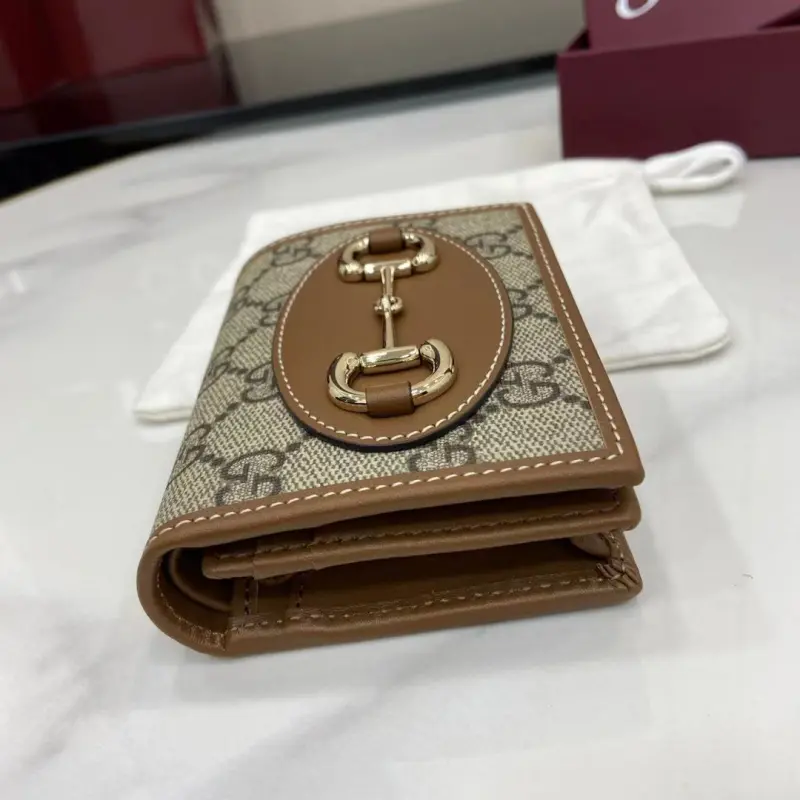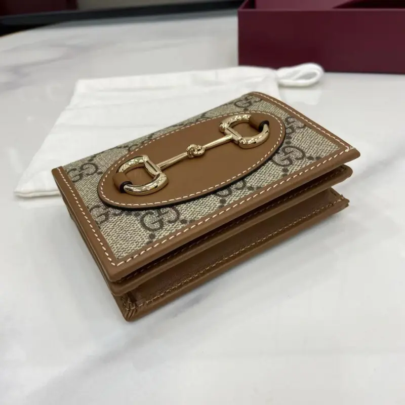 [With a full set of original counter packaging][New product]New GG letter pattern coated canvas, creating a soft, light and durable exquisite material. This Gbag Horsebit 1955 series card holder is ingeniously presented in beige and dark brown, cleverly integrated with exquisite brown leather piping. Beige and dark brown new GG letter pattern coated canvas Brown leather piping Light gold-tone hardware Moir?? fabric lining Horsebit buckle details Interior: 5 card compartments, 1 open pocket, 1 zipper pocket and 1 banknote compartment Snap button closure model: 621887. Dimensions when open: 11 cm (width) x 17.5 cm (height) Dimensions when closed: 11 cm (width) x 8.5 cm (height) x 3 cm (depth) Color: brown gum brown pvc/original leather. Made in Italy