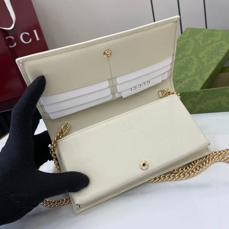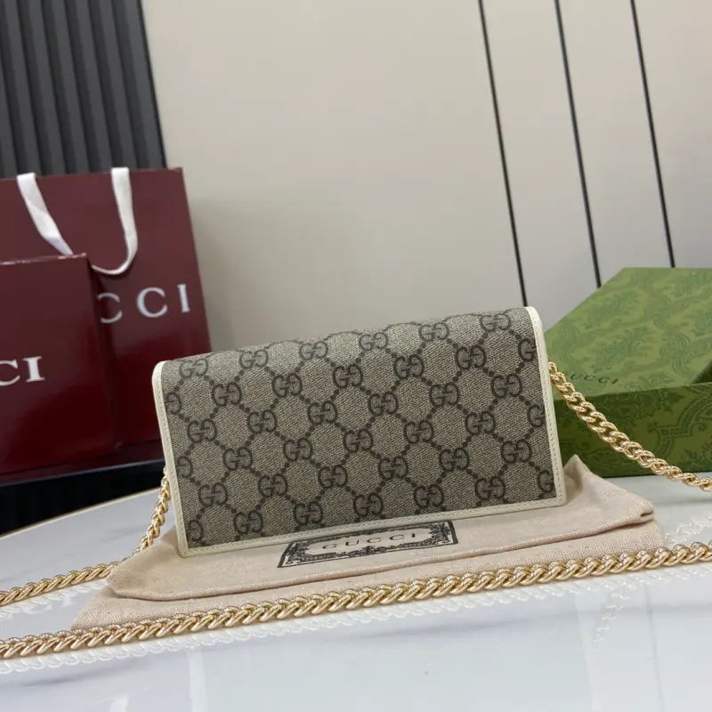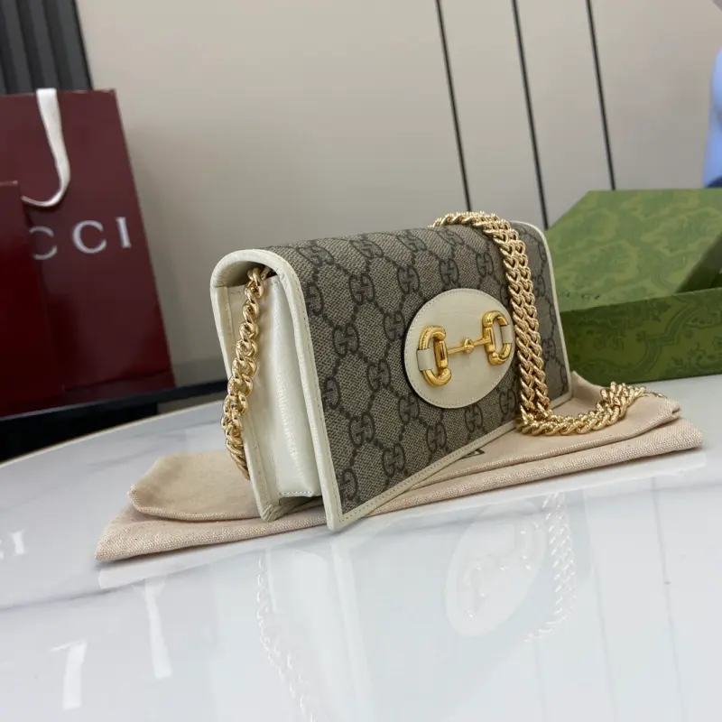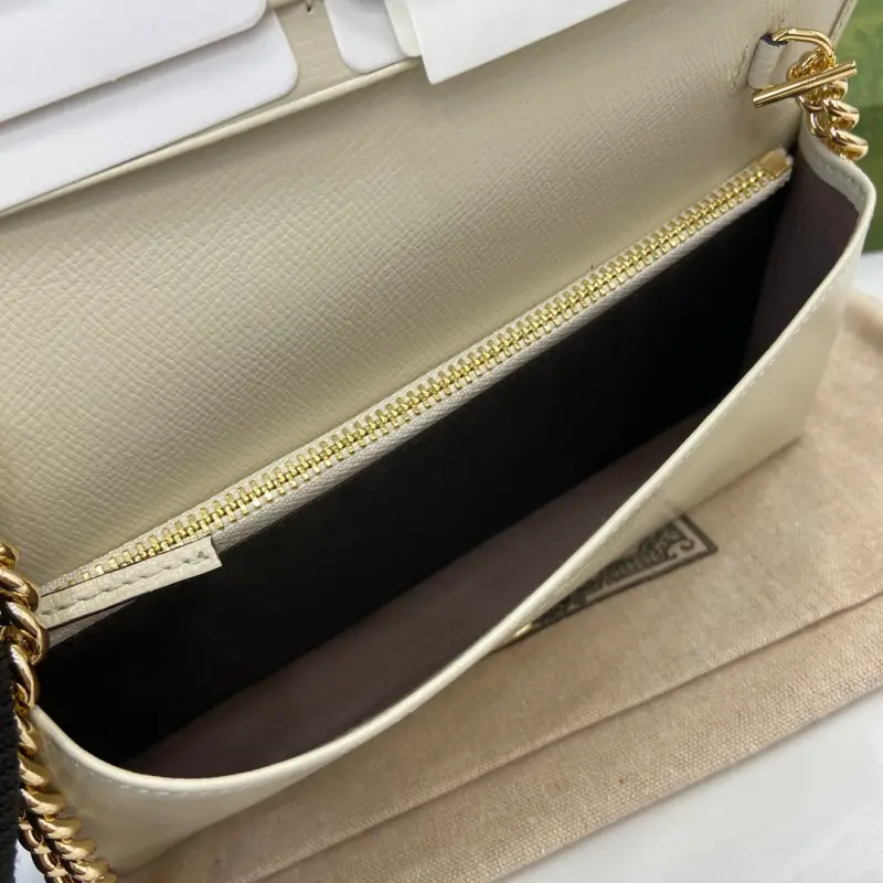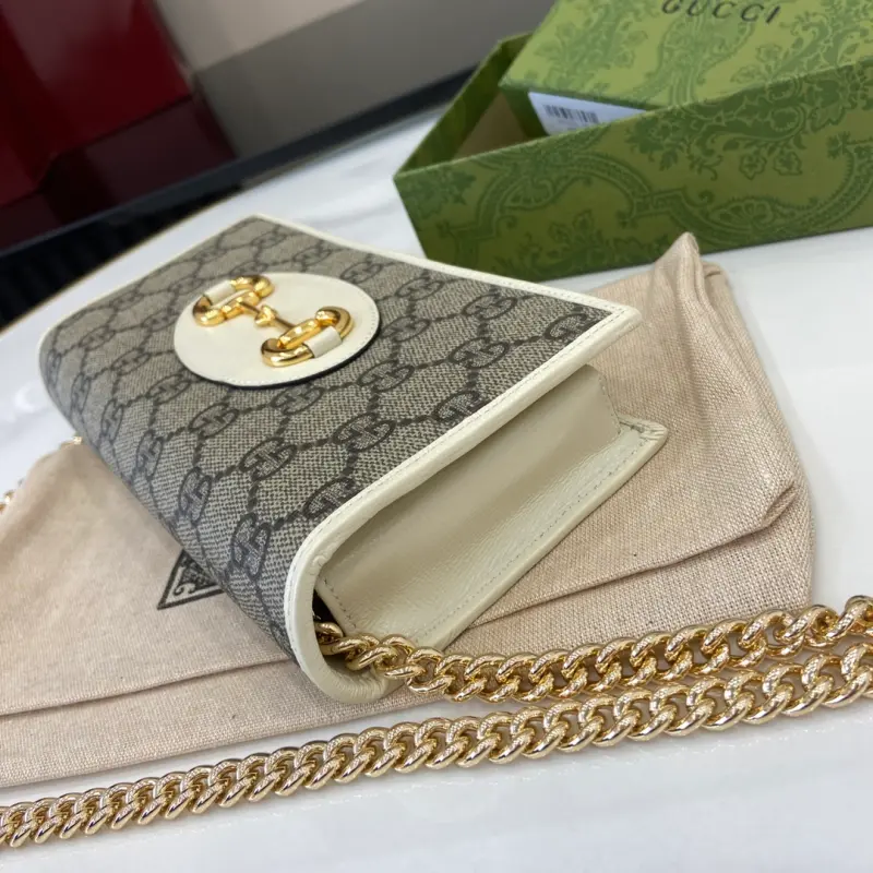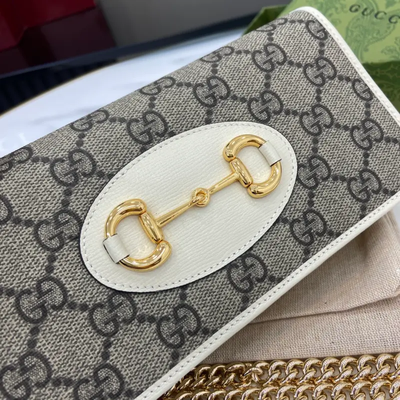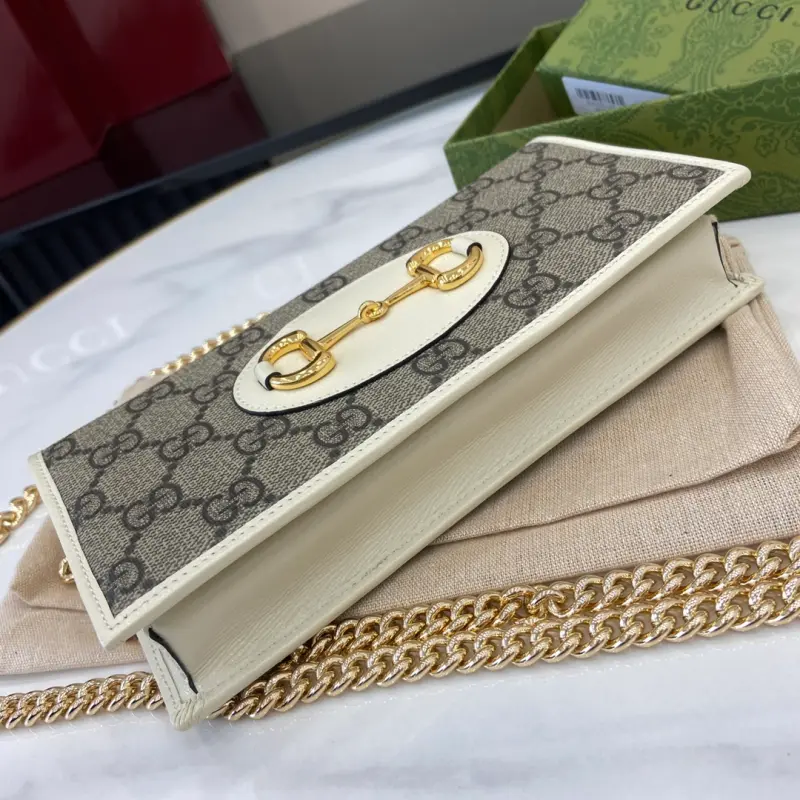 Gbag Horsebit 1955 wallet on chain. This wallet on chain is a new addition to the Gbag Horsebit 1955 accessories collection. Crafted from canvas featuring the brand’s signature Double G monogram, it features the double loop and long, rectangular design common to the collection’s bags. Its classic flap closure with snap closures houses several card slots and pockets, while the detachable chain strap allows for versatile styling. White leather details create a chic and stylish look. Made of beige/ebony GG Supreme canvas with white leather details, gold-tone hardware, a moir?? and suede lining, and a horsebit detail, it has six card slots, one zippered pocket, and one open pocket. The detachable chain strap has a 58cm drop and snap closure. Weight: approximately 0.3kg. Model No. 621892. Dimensions when open: 19(W) x 21(H) x 2.5cm(D) Dimensions when closed: 19(W) x 10(H) x 4cm(D) Colour: White/pvc.