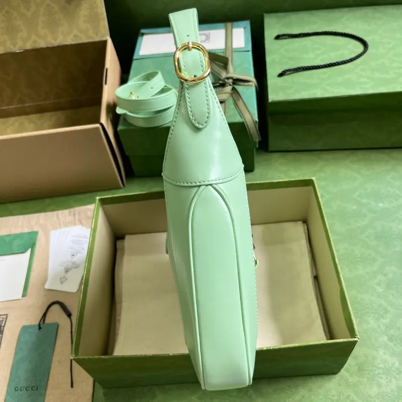 Comes with a full set of original green box packaging. A limited edition classic from the Jackie 1961 collection. The entire 1961 collection has become a brand classic. This season’s new all-leather white model is a stunning sight, showcasing the irreplaceable allure of genuine leather. This style is light and stylish, without the heavy branding, featuring only the brand logo on the buckle. The Jackie handbag is also very practical, with a detachable shoulder strap that allows it to be carried sideways or crossbody, making it versatile and easy to pair with work, casual, or even rock styles. Model: 636709. Dimensions: 27.5*19*4cm. Color: Light Green/Turquoise Leather.