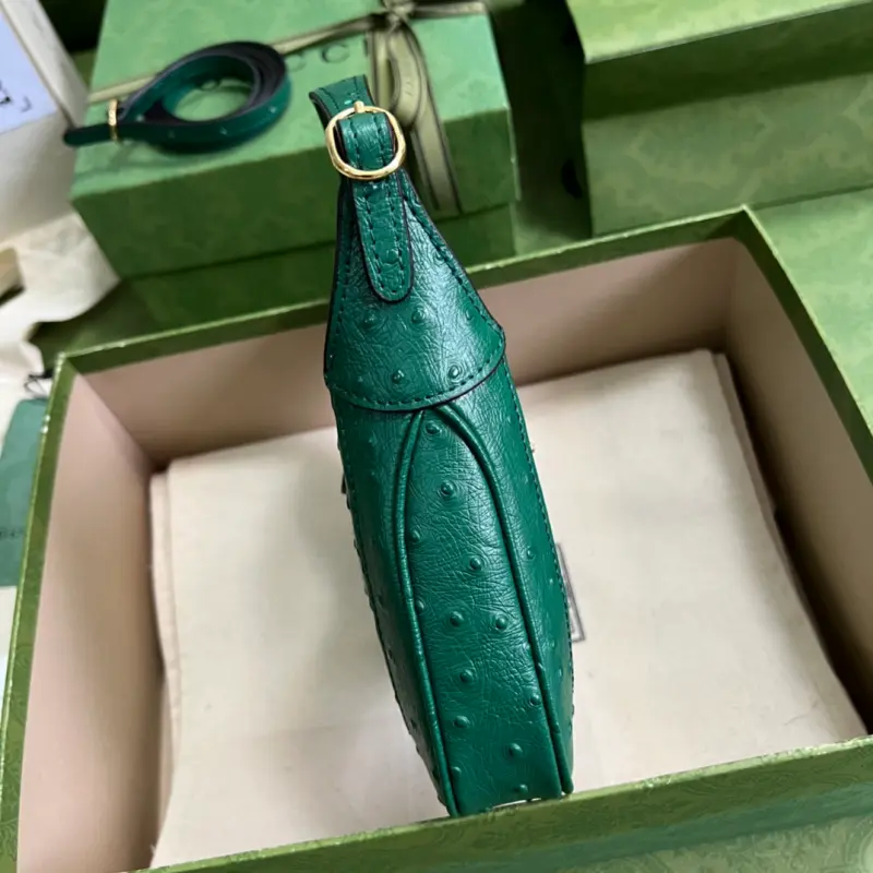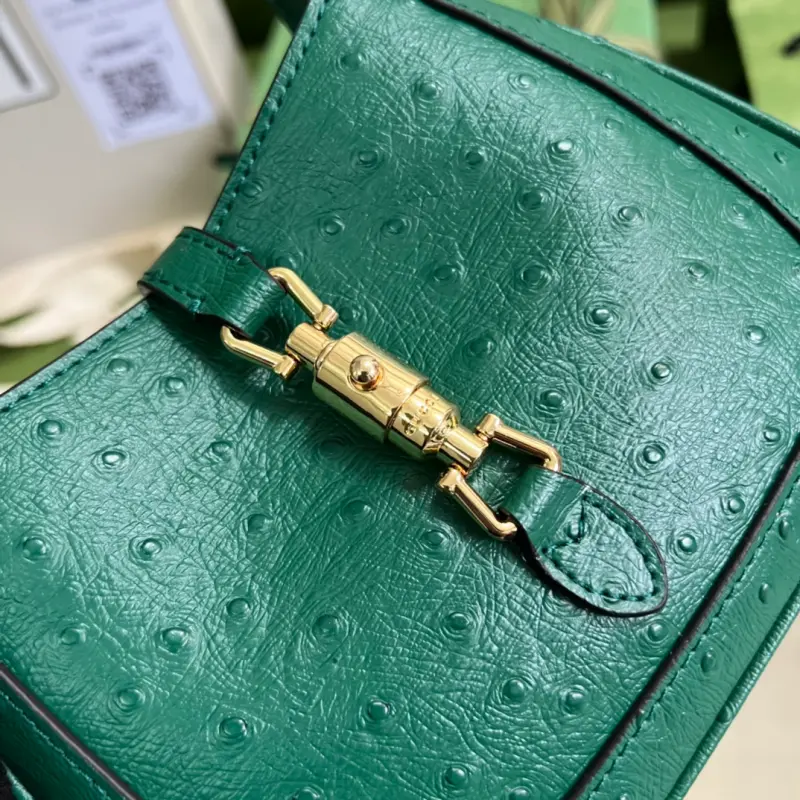 Comes with a complete set of original green packaging. The updated GG Jackie ostrich-print underarm bag. After six months of popularity, the Jackie continues to be incredibly popular. Major brands have released underarm bags, demonstrating just how popular this fashion trend has become. Underarm bags have been around since the last century and have remained a classic to this day. A GG underarm bag is a true icon, sure to drive you crazy. This is a must-have this year. Model: 637091. Dimensions: 19 x 13 x 3 cm. Color: Green/Ostrich-print leather.