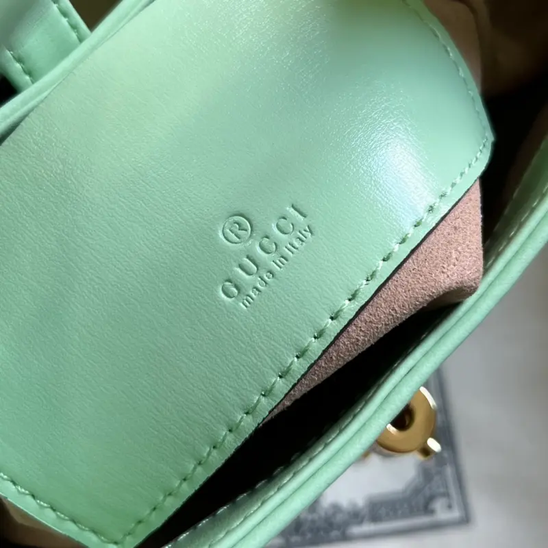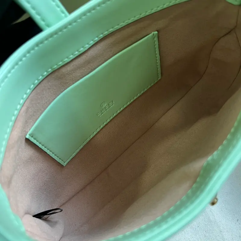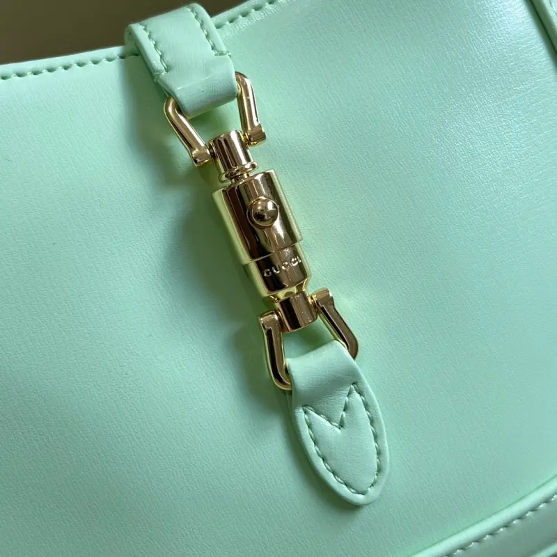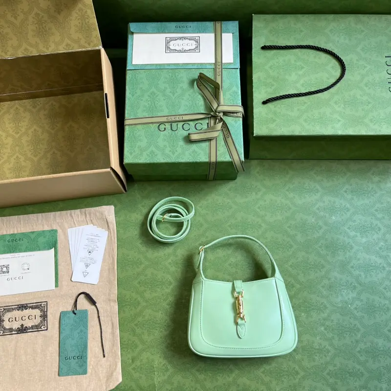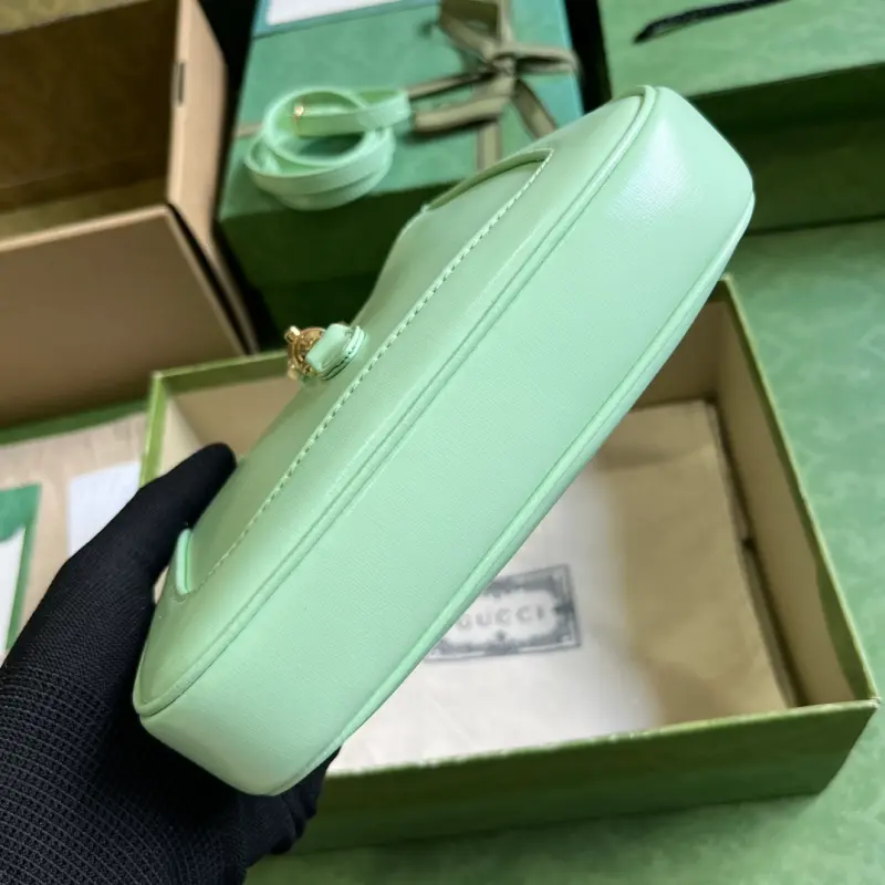 Comes with a complete set of original green packaging. The updated GG Jackie plain leather underarm bag. After six months of popularity, the Jackie continues to be incredibly popular. Major brands have released underarm bags, demonstrating just how popular this fashion trend has become. Underarm bags have been around since the last century and have become a classic. A GG underarm bag is a true icon, sure to drive you crazy. This is a must-have this year. Model: 637091. Dimensions: 19 x 13 x 3 cm. Color: Light green/plain leather.