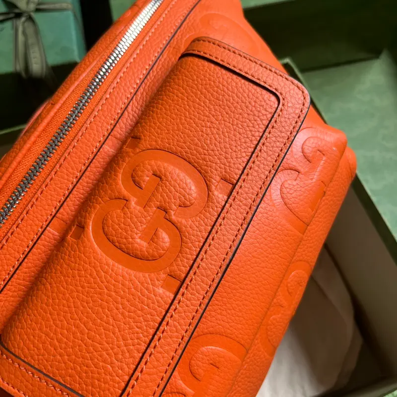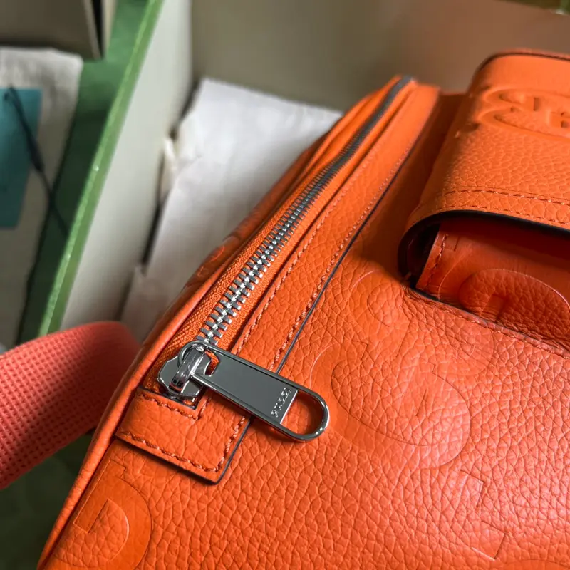 [Includes full original green box packaging] Super Double G waist bag. The orange Super Double G design makes a dazzling return in the Pre-Fall 2023 collection, appearing on a variety of leather travel luggage. A reimagined interpretation of Gbago Gbag’s initials, the Super Double G motif is presented in an oversized, striking silhouette, evoking the timeless allure of the brand’s iconic logo. Crafted from the brand’s signature leather, this waist bag can be worn cross-body for versatile carry. Made of orange Super Double G leather with a cotton and linen lining, it features a front magnetic pocket, a zipper closure, and an adjustable waist strap. Weight: approximately 0.56 kg. Model No. 645093. Dimensions: 28 cm (width) x 18 cm (height) x 8 cm (depth). Color: Orange/Original Embossed G Leather.