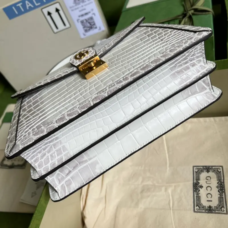 Comes with full original green packaging. This 2022 GG Orphidia collection is the latest Himalaya model. Its classic retro style is a rare piece from the collection that appeals to all ages. The Ophidia collection continues to grow, introducing stunning new pieces each season. This handbag, part of the Epilogue collection, features a detachable shoulder strap. Its square, retro shape incorporates the brand’s signature striped webbing and Double G hardware, crafted with the brand’s signature Double G motif. Model No. 651055. Dimensions: Length 25cm x Height 17.5cm x Side Width 7cm. Color: White/Crocodile-grain leather.