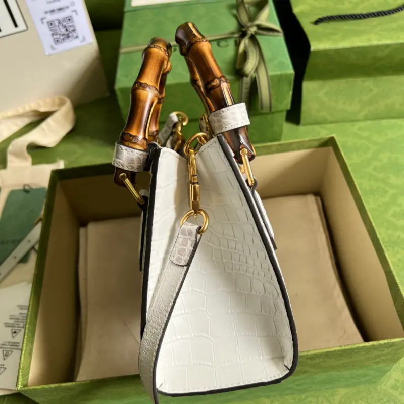 [Includes full original green box packaging] This small authentic leather bamboo tote bag from Gbag’s “Aria” collection offers a modern interpretation of a classic element. Bamboo, a Gbag signature, has been featured in various collections since the 1940s. After more than eight decades of evolution, this classic element is reimagined in white leather for this small tote. The bag also features two interchangeable shoulder straps: a smooth leather strap for an elegant and timeless look, and a striped webbing strap for a strong brand identity. Model No. 655661. Dimensions: 20*16*10cm. Color: White/crocodile-grain leather.