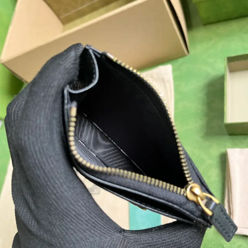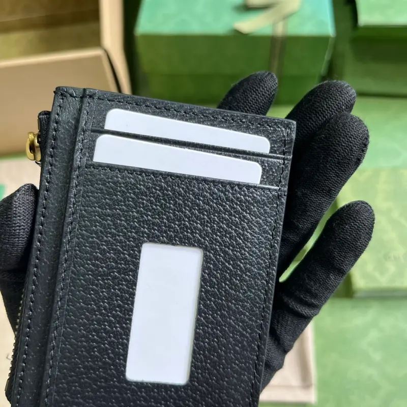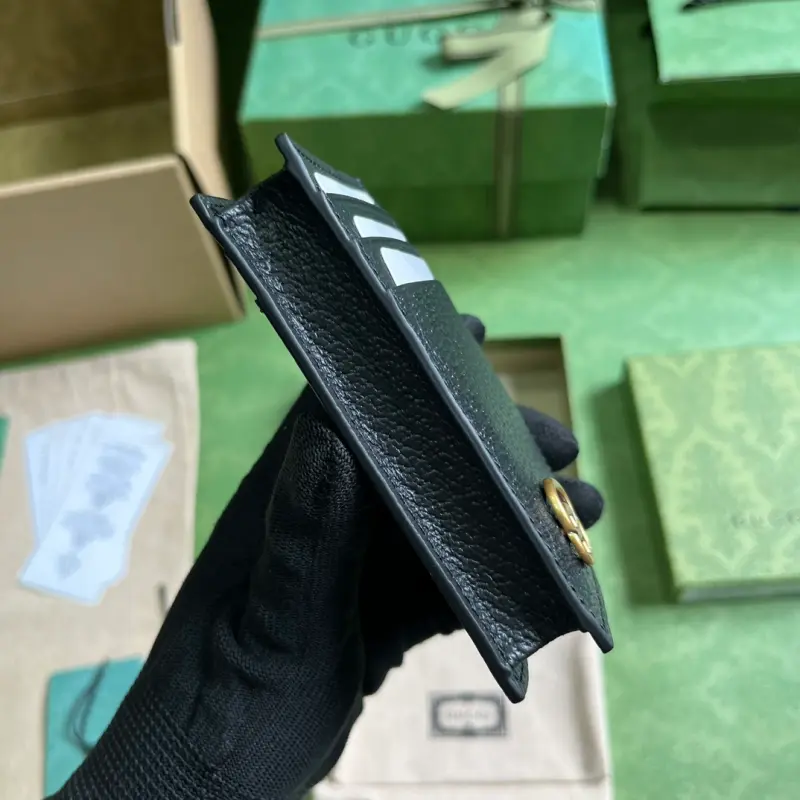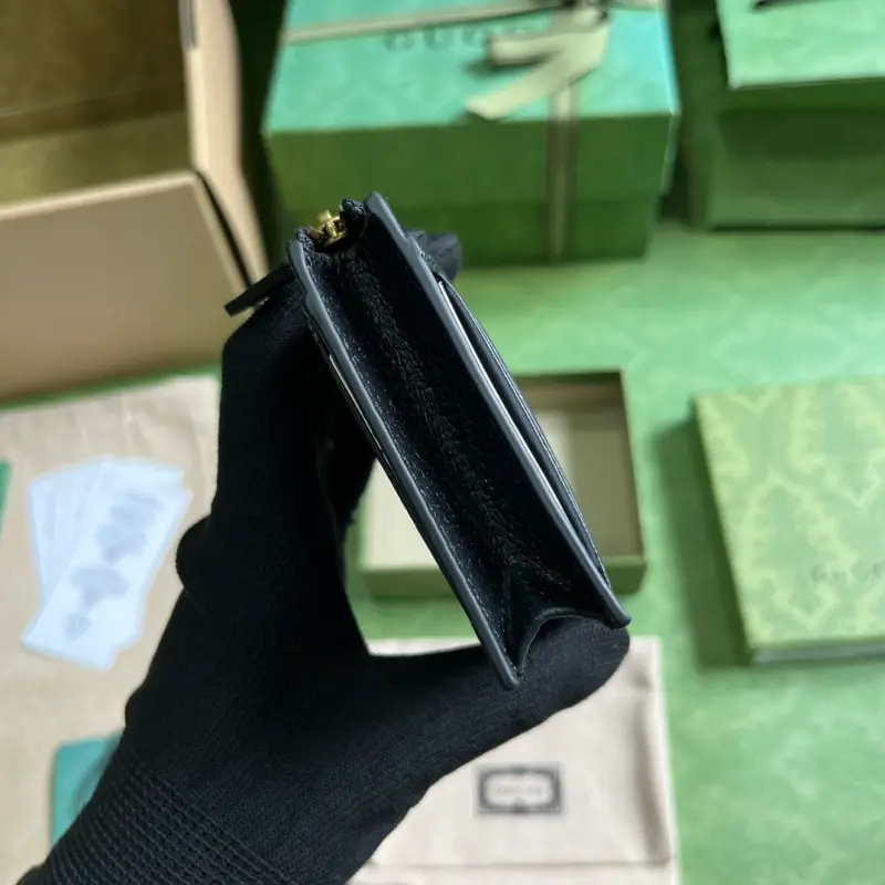 This GG Marmont card holder, complete with original green box packaging, features a new look each season, showcasing the brand’s rich heritage. This card holder is crafted from black leather and embellished with the iconic Double G symbol from the 1970s. It features black leather, gold-tone hardware, a viscose-lined Double G, six card slots, and a zippered pocket. Model No. 657589. Dimensions: 12 cm (width) x 8 cm (height). Color: Black/Full Leather.