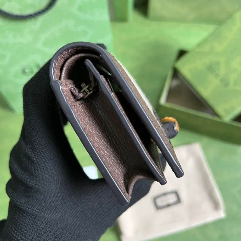 This original leather bamboo card holder, part of Gbag’s “Aria” collection, features a modern interpretation of a classic element. Bamboo, a Gbag signature, has been featured in various collections since the 1940s. After more than eight decades of evolution, this classic element is reimagined in black leather. The bag also comes with two interchangeable straps: a smooth leather strap for an elegant and timeless look, and a striped webbing strap for a strong brand identity. Model No. 658244. Dimensions: 9*10*3cm. Color: Brown/Canvas.