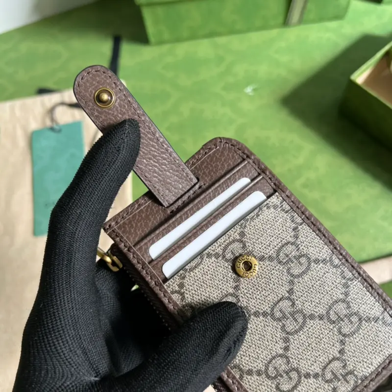 The latest card holder has arrived, complete with original green box packaging. It can also be used as a wallet, making it a practical design staple. The classic GG pattern, a signature element of the brand since the 1930s, continues to inspire new expressions nearly a century later. Model: 671723. Dimensions: 12*7.5*1cm. Color: Brown/PVC.