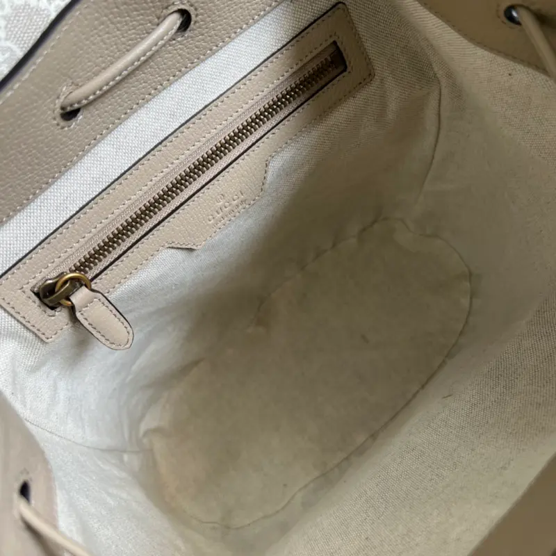 Comes with a complete set of original green box packaging. GG fabric is a classic material used extensively in the brand’s handbags and ready-to-wear collections. In the “Gbag Love March” fashion collection, this highly recognizable classic jacquard returns, featuring an all-over design that adds rich detail to a variety of classic luggage pieces. Brown leather trim adds a touch of class to this backpack. Details: Made of rice rubber and ivory GG jacquard with rice rubber and leather trim, and gold-tone hardware. Model No. 674147. Dimensions: 26.5 x 30 x 13 cm. Color: Rice rubber oatmeal/PVC.