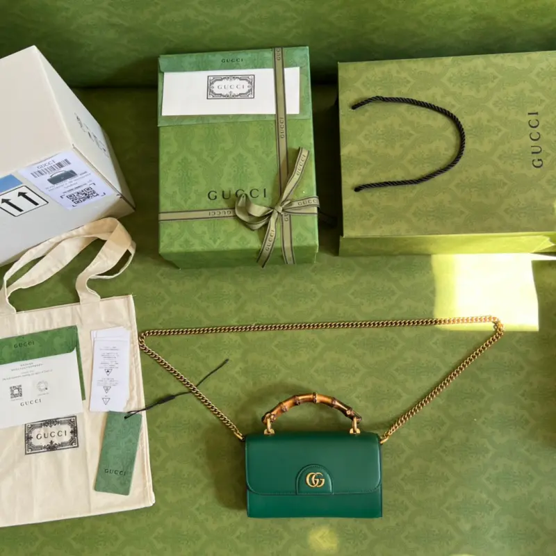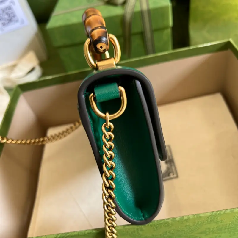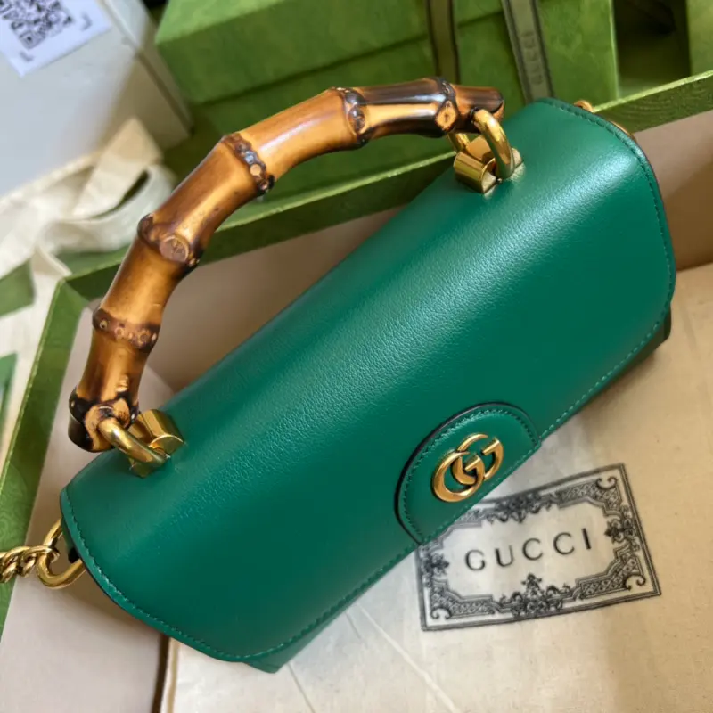 This mini tote bag, complete with original green box packaging, features two recognizable brand elements: bamboo handles and Double G hardware. The leather material contrasts beautifully with two neon-colored buckled straps, creating a playful and elegant look. Model: 675794. Small size: 20cm. Color: Green/full leather.