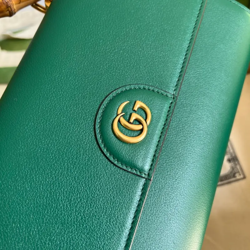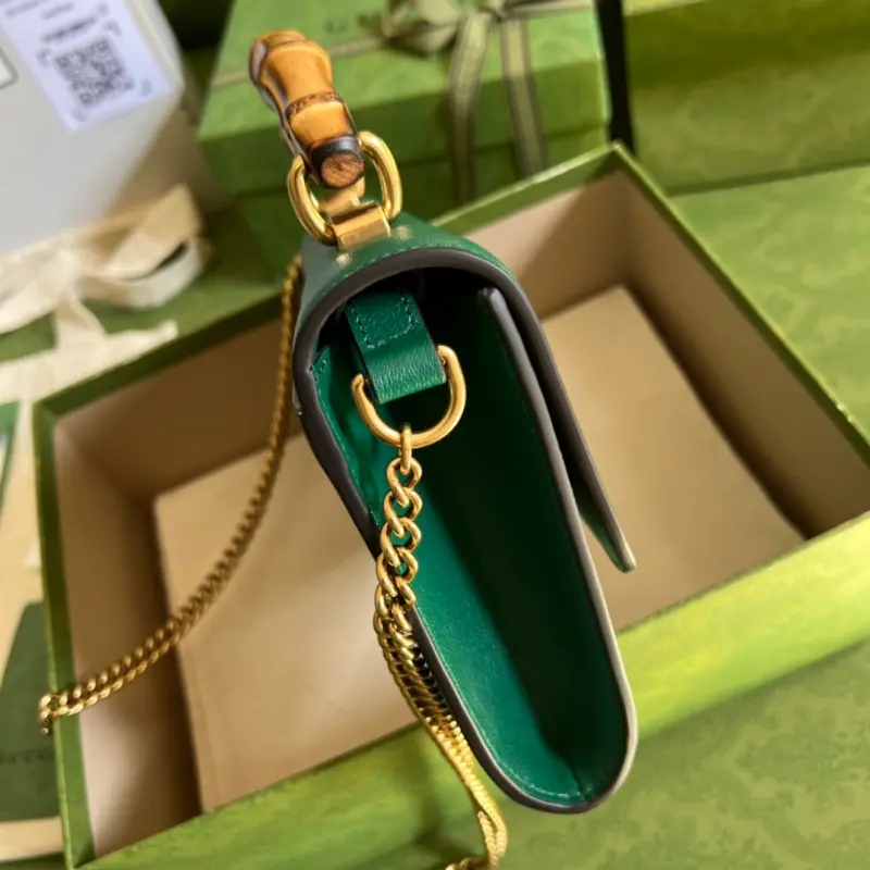 This mini tote bag, complete with original green box packaging, features two recognizable brand elements: bamboo handles and Double G hardware. The leather material contrasts beautifully with two neon-colored buckled straps, creating a playful and elegant look. Model: 675795. Large size: 26cm. Color: Green/full leather.