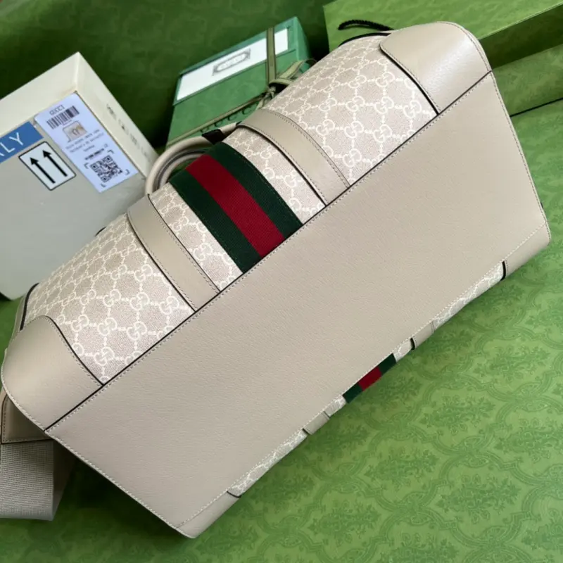 This travel bag, featuring a complete set of original green gift bags, is crafted from PVC with the brand’s signature Double G monogram pattern, a trendy bowling bag design. The red and blue webbing complements the stylish bowling bag silhouette, while the classic striped webbing detail further enhances the design’s retro appeal. A shoulder strap and handles offer versatile carrying options. All of the brand’s pieces feature versatile, practical designs and styles, highlighting the brand’s diverse and inclusive personality. Model: 681295. Dimensions: 44*27*24cm. Color: Rice Gum Oatmeal/PVC.