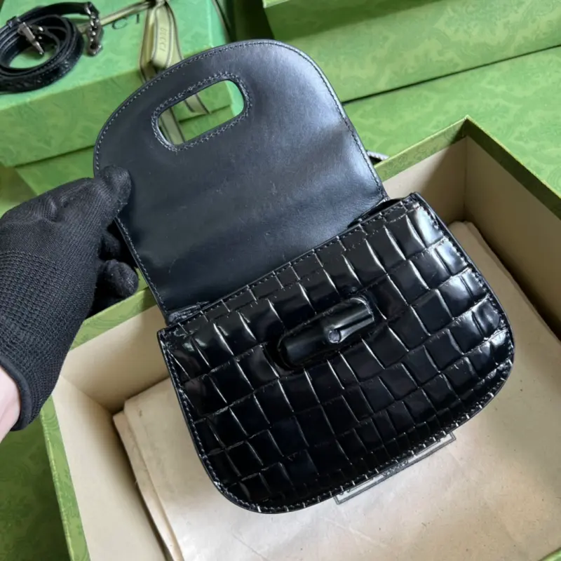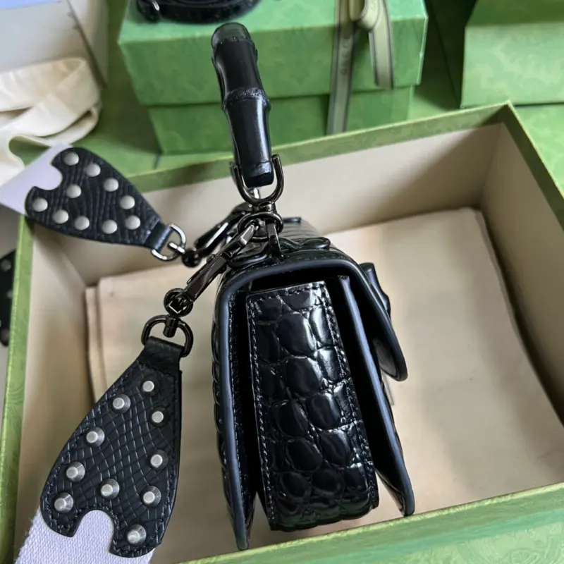 [Includes full original green box packaging] New Gbag “Aria – Fashion Aria” Gbag new counter quality, real product photos, made of exclusive custom-made top-grain crocodile-grain cowhide, the new bamboo palace handbag. Bamboo is a classic Gbag element and has been an exclusive royal symbol since the last century. Naturally charcoal-grilled and handcrafted, it draws on the inherent beauty of nature and presents a refreshing new look in this handbag! The crocodile-grain pattern highlights the high-end and elegant design, and the entire bag exudes a charming aura. It will make you look radiant and dazzling whether you’re working or shopping. It’s truly stunning. Model: 686864. Dimensions: 17 x 12 x 7.5 cm. Color: Black/crocodile-grain leather.