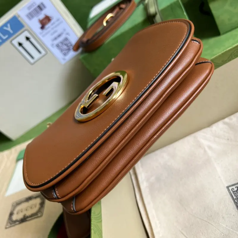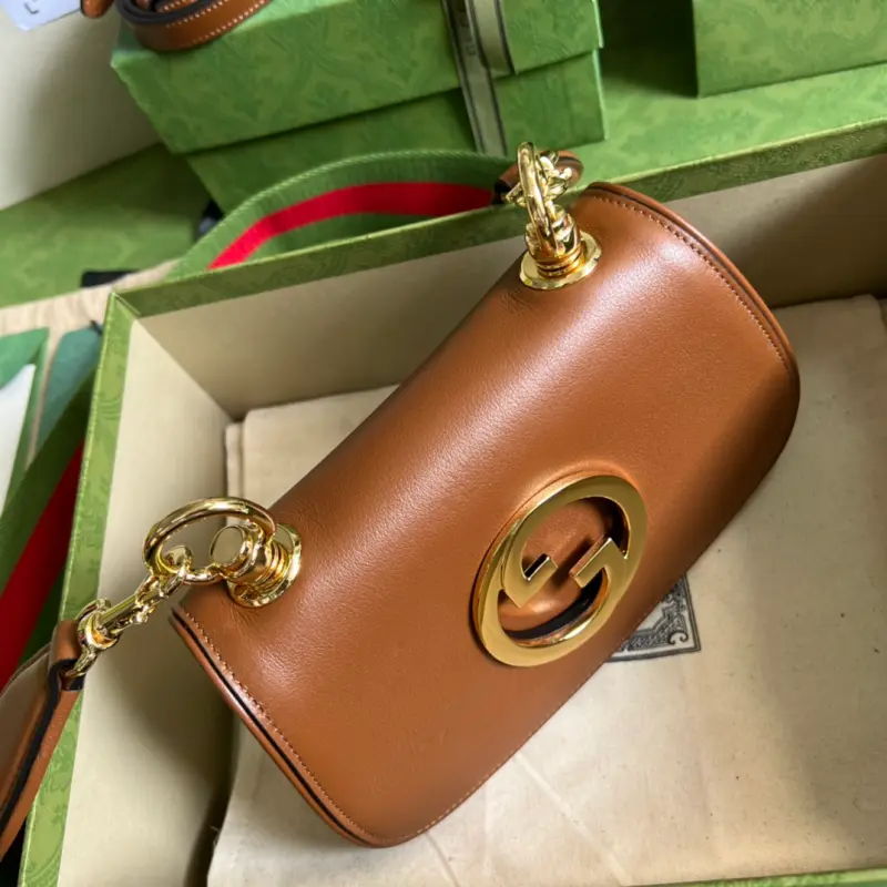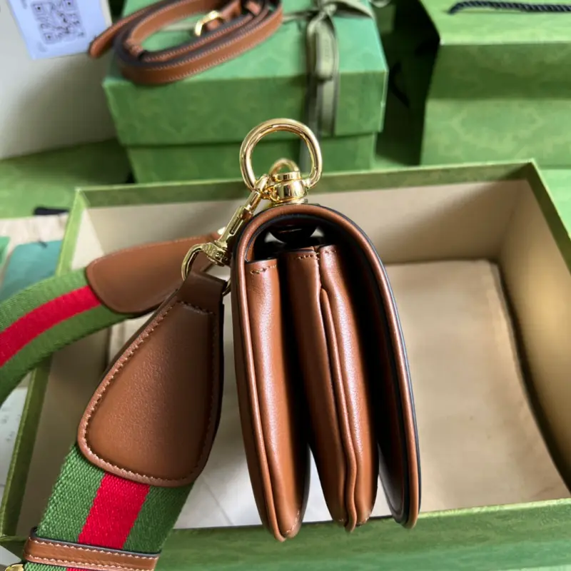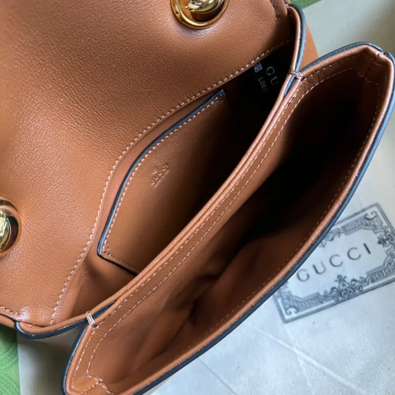 The GG “Gbag Love March” collection features a selection of unique pieces from the brand’s archive, reimagining the Interlocking GG logo with geometric shapes. Gold-toned hardware adds a touch of vintage elegance to these pieces, evoking a timeless design that reflects the setting of the show. This light brown leather mini bag features two interchangeable shoulder straps: brown leather or striped web, allowing you to customize your look. Model No. 698643. Dimensions: 22 x 13 x 5.5 cm. Color: Brown/leather.