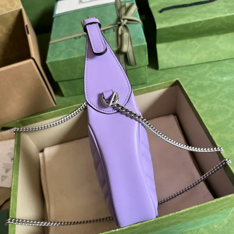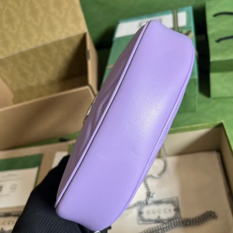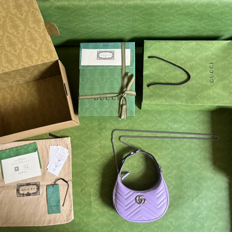 GG Marmont Half-Moon Mini Handbag (Includes full original green box packaging). This mini handbag features a crescent shape and textured light purple leather, exuding a rich vintage feel. Each collection explores a different era, blending vintage elements with archival pieces or contemporary details to create a timeless and innovative design. The GG Marmont collection reflects the brand’s deep fascination with history, and this compact accessory is no exception. Features light purple quilted V-shaped leather with palladium-tone hardware, featuring a Double G. Interior: two card slots, a hook, an adjustable handle (16 cm drop), a chain shoulder strap (60 cm drop), and a zipper closure. Weight: Approximately 0.395 kg. Model No. 699514. Dimensions: 21.5 cm (width) x 11 cm (height) x 5 cm (depth). Color: Purple/Original Leather.