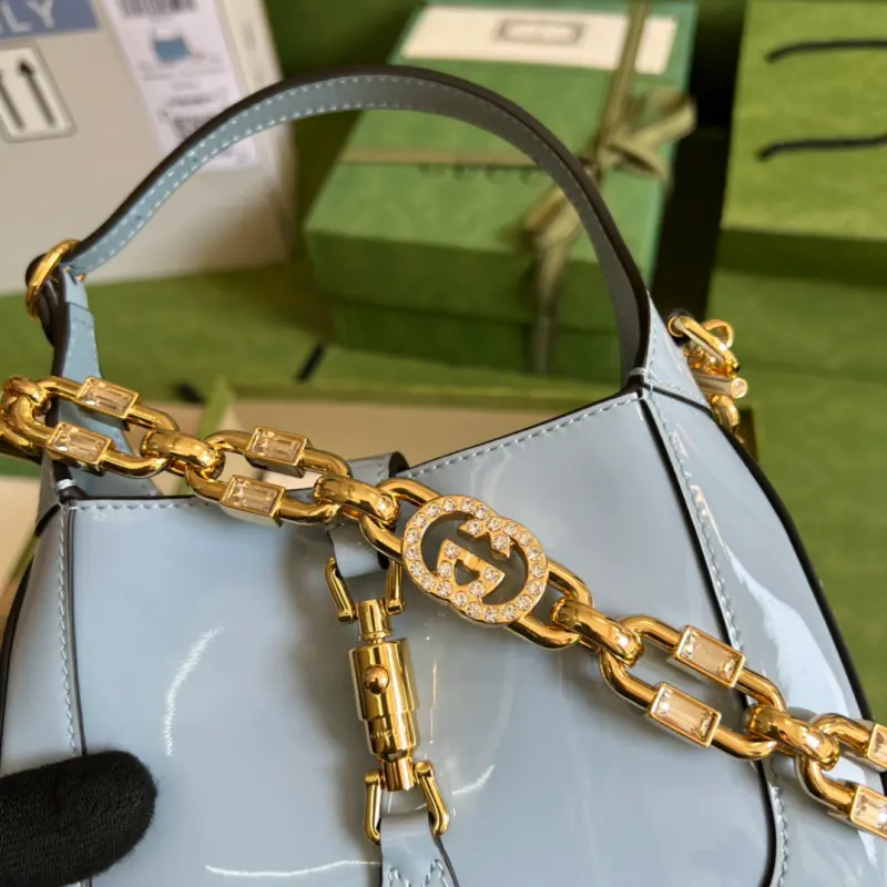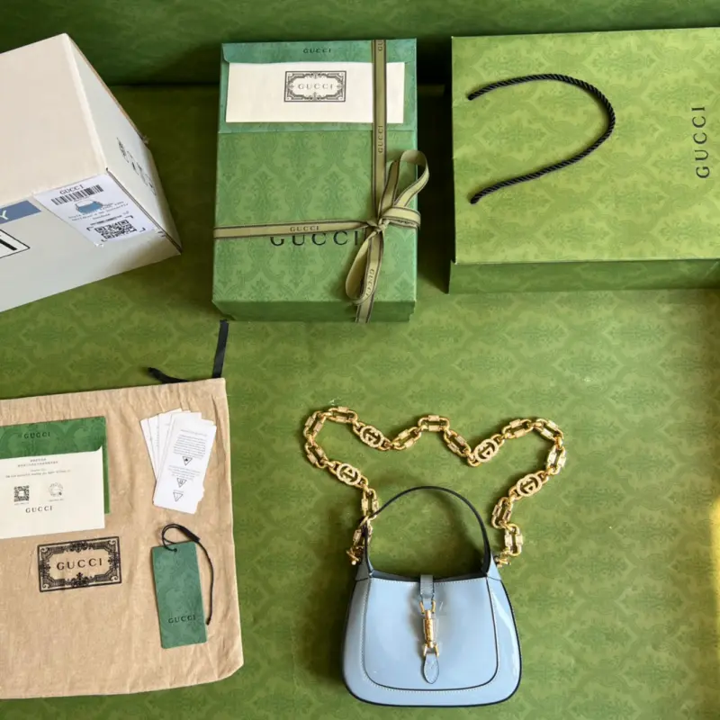 [Comes with a full set of original green box packaging] Jackie 1961 series mini shoulder bag, this piece is made of dazzling patent leather, playful yet sophisticated. This Jackie 1961 series mini handbag interprets this highly lustrous material with a bright light blue, adding another fashionable masterpiece to the “Gbag Love March”. The bold color scheme echoes the concept of self-expression in this season’s fashion show. Light blue patent leather, gold-tone hardware, handle height: 10 cm, crystal interlocking double G detachable chain shoulder strap (40 cm high), push-in lock. Model: 699651. Mini size: 19 (width) x 13 (height) x 3cm (depth) Color: light blue/patent leather. Made in Italy