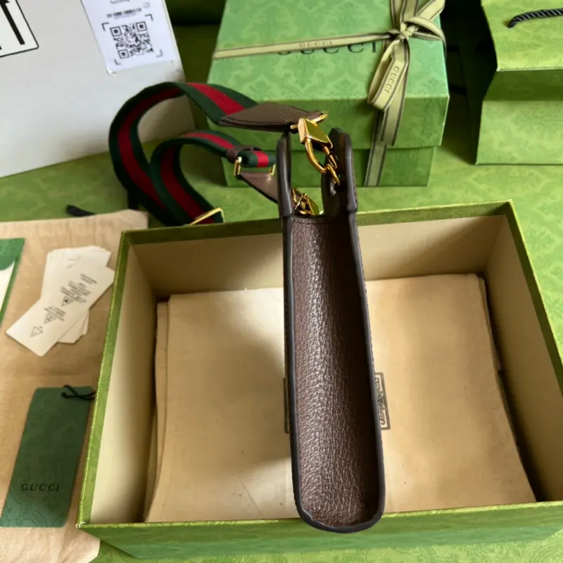 The Ophidia mini GG shoulder bag, featuring a unique new interpretation of the Ophidia collection, is presented in a striking new way. The metal eyelets and rivets evoke punk style, elevating the classic silhouette with a uniquely alluring touch. This mini shoulder bag is crafted from the brand’s signature GG Supreme canvas, creating a playful contrast. It features brown GG Supreme canvas, gold-tone hardware, and a red and blue web with the Double G. Model No. 699770. Dimensions: 14cm (width) x 22.5cm (height) x 4.5cm (depth). Color: Brown/PVC.