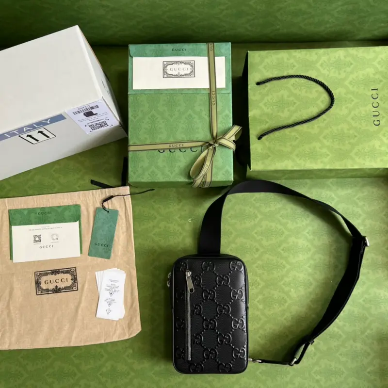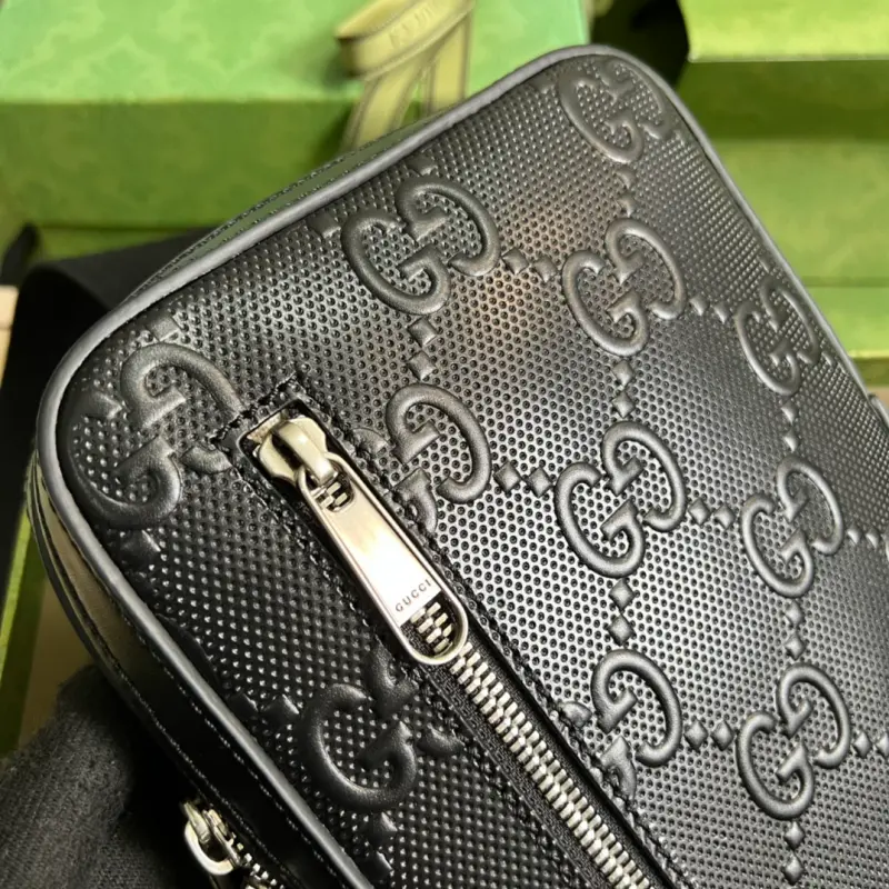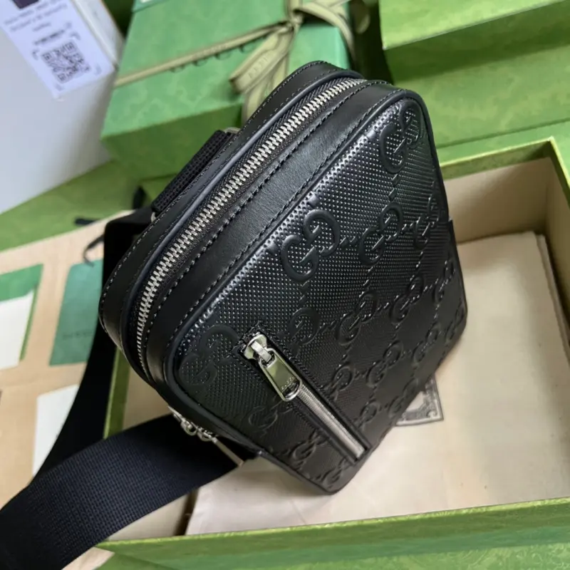 This GG-embossed shoulder and crossbody bag, featuring a clever use of texture, combines suppleness with an all-over embossed logo. Its subtle sheen exudes a modern elegance, adding a touch of allure to this shoulder and crossbody bag. Black GG-embossed leather with vintage palladium-tone hardware and cotton and linen lining. Interior: 1 leather card compartment. Exterior: Front zipper pocket, shoulder strap, zipper closure. Model No. 700431. Dimensions: 16cm (width) x 24cm (height) x 5cm (depth). Color: Black/embossed G leather.