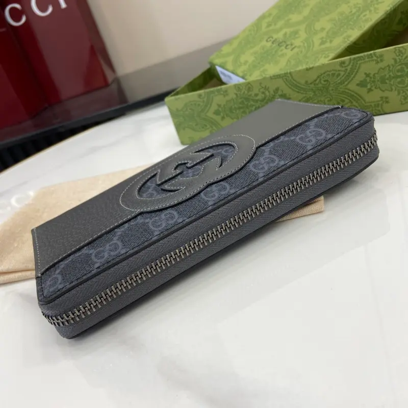 This wallet features a cutout Interlocking GG logo. Since its creation in the 1960s, the iconic Interlocking G logo has been an integral design element throughout Gbag’s collections. Derived from the initials of Gbago Gbag, the logo has been continually reinvented in various forms and styles. This wallet, crafted from leather and GG Supreme canvas, features a cutout detail, creating an accessory that embodies both modern style and classic elegance. The design is crafted from black and brown GG Supreme canvas with black leather trim and a moir?? fabric lining. The Interlocking G logo features a cutout detail. The interior includes eight card slots, three bill compartments, and a zippered compartment. Model No. 701423. Dimensions: 19 x 10 x 3 cm. Color: Gray leather/PVC.