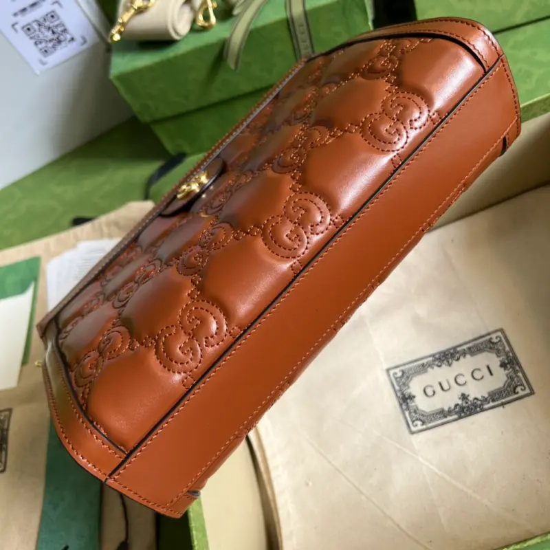 The GG matelass?? leather shoulder bag UM8HG 1046, which comes with a complete set of original green box packaging, continues to stand out in its unique style. With its ultra-soft finish, the iconic material is once again reimagined as part of the Gbag Love Parade, featuring a textured geometric pattern. The design presents a contemporary take on the ’90s logo trend, which has appeared in the House’s latest collections. Here, it appears in a minimalist shade of brown. Made of brown GG matelass?? leather with gold-tone Double G hardware. Model No. 702200. Dimensions: 26*17.5*8cm. Color: Brown/Original G Embossed Leather.