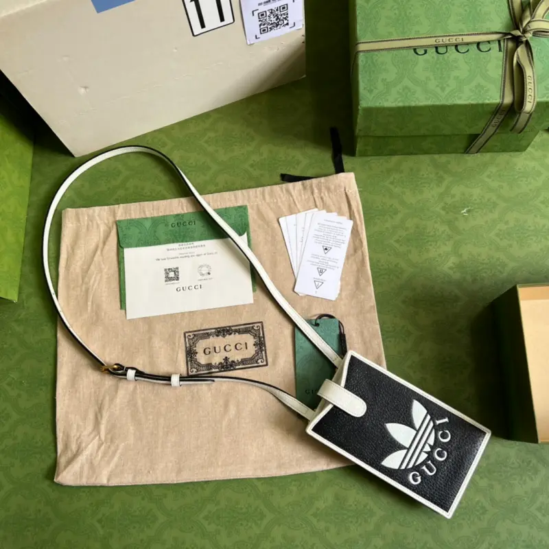 As part of the ad GG collaboration, the 1955 mini crossbody bag features a Trefoil print. Integrating the rich and historic heritage of both brands, the adidas x Gbag collaboration celebrates the brand’s history and iconic design language through a three-line design. Creative Director Alessandro Michele drew inspiration from the 1980s and 1990s, creating a collection that blends nostalgia with modern flair. Model No. 702203. Dimensions: 10 (width) x 17 (height) x 2.5 cm.