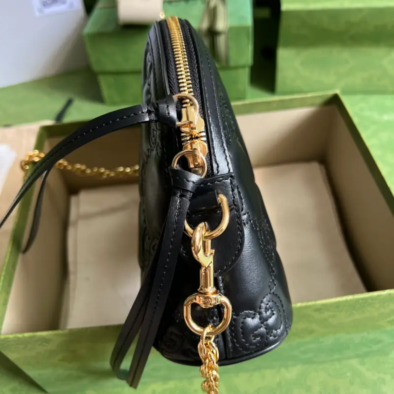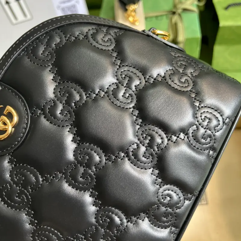 The original matelass?? leather shoulder bag UM8HG 9500, featuring a new and unique design each season, is at the forefront of the creative director’s designs. With its ultra-soft finish, the iconic material is once again reimagined as part of the Gbag Love Parade, with a textured geometric pattern. The design presents a contemporary take on the ’90s logo trend, which has appeared in the House’s latest collections. Here, it enriches the rounded black shoulder bag. Made of GG matelass?? leather with gold-tone hardware featuring the Double G. This item comes with an additional leather shoulder strap. Model No. 702229. Dimensions: 23.5*19*8cm. Color: Black/embossed G full leather