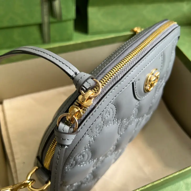 The UM8HG 9500 matelass?? leather shoulder bag, featuring a full set of green packaging, is at the forefront of the creative director’s designs, appearing in new and unique ways each season. With its ultra-soft finish, the iconic material is once again reimagined as part of the Gbag Love Parade, with a textured, geometric pattern. The design presents a contemporary take on the ’90s logo trend, which appeared in the House’s latest collections. Here, it enriches the rounded shoulder bag in gray. Made of GG matelass?? leather with gold-tone hardware, the Double G is included with an additional leather shoulder strap. Model No. 702229. Dimensions: 23.5*19*8cm. Color: Gray/embossed G full leather