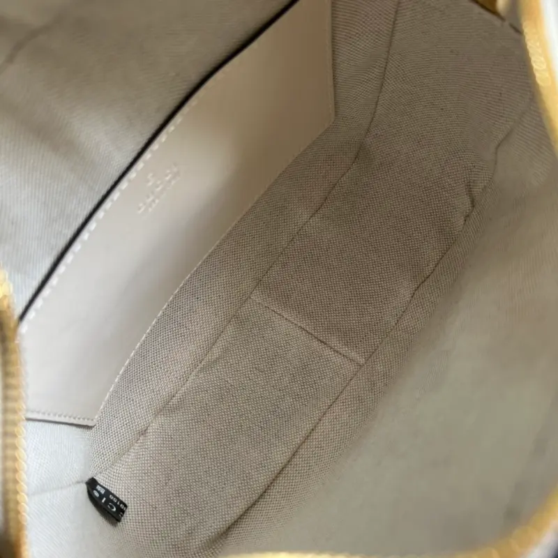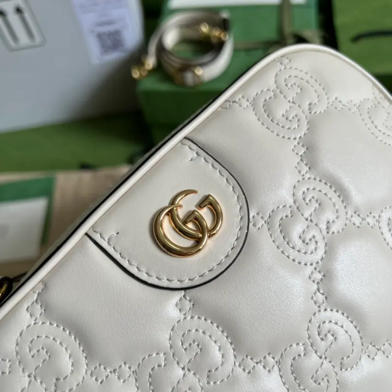 The Ophidia “Gbag Love March” collection, featuring a new collection (complete with original green packaging), kicked off with a runway show on the Los Angeles Walk of Fame, marking the brand’s first in-person runway show since February 2020. Inspired by the enduring glamour of Hollywood, the collection features a variety of classic yet modern pieces. This Ophidia crossbody bag, crafted from large GG leather, reimagines the classic GG motif, reinterpreted by Gbago Gbag. It features white Super Double G leather trim. Model No. 702234. Dimensions: 21.5 x 17 x 7.5 cm. Color: White/embossed leather.