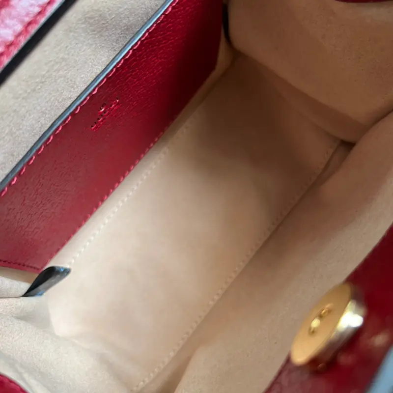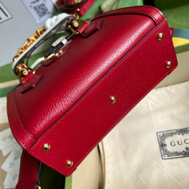 [With a full set of original green box packaging] Original leather bamboo small handbag Gbag’s “Aria-Fashion Aria” series uses modern techniques to reinterpret classic elements. Bamboo is one of Gbag’s classic elements and has appeared in various series of the brand since the 1940s. After more than 80 years of development and evolution, this classic element is combined with pink leather and presented in a new way on this small handbag. The handbag also comes with two interchangeable shoulder straps-the smooth leather material shows an elegant and classic temperament, and the striped webbing shoulder strap highlights the strong brand connotation. Model: 702732. Size: 20*16*10cm. Color: red leather/with white strap